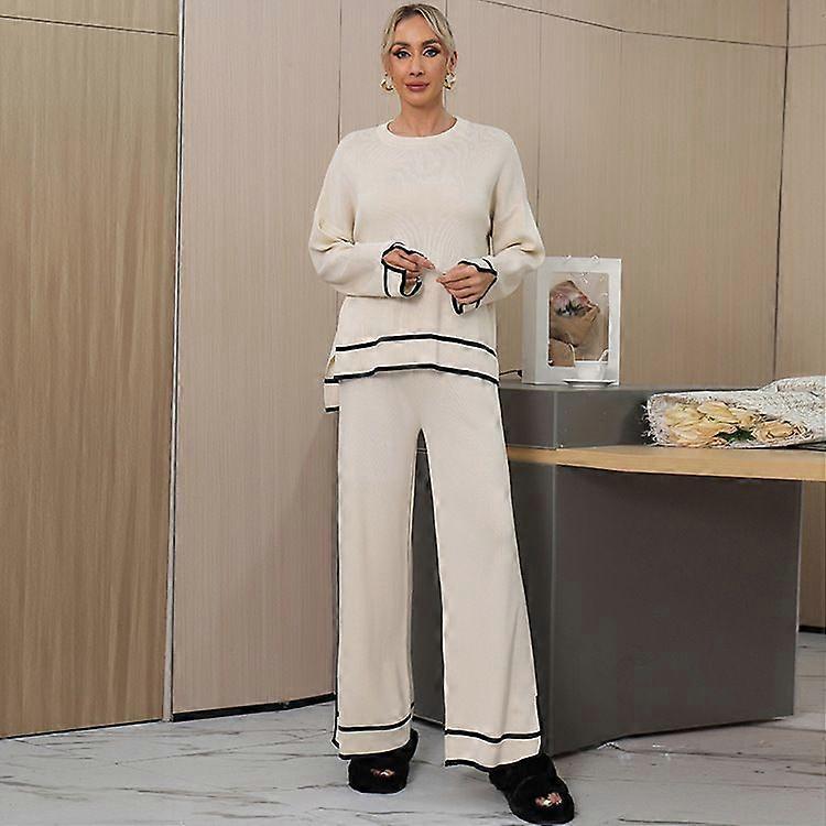 A Two-Piece Set Of Autumn And Winter Color-Blocking Slit Long-Sleeved Knitted Sweater And High-Waisted Wide-Leg Pants In Solid Colors For Women