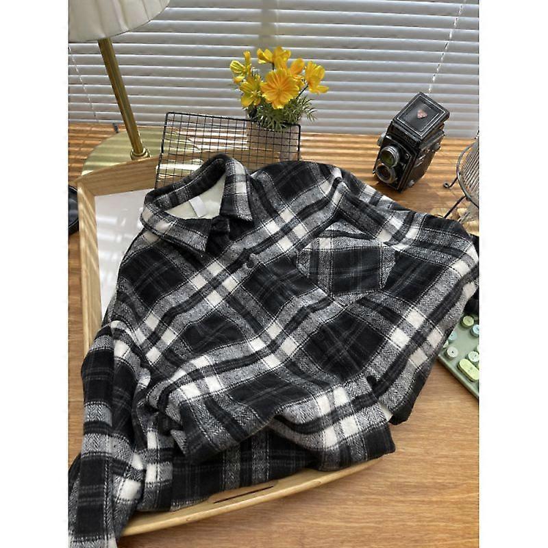Vintage Hong Kong-Style Brushed Plaid Fleece Shirt Women's Autumn And Winter Thickened Long-Sleeved Jacket Loose Lazy Top
