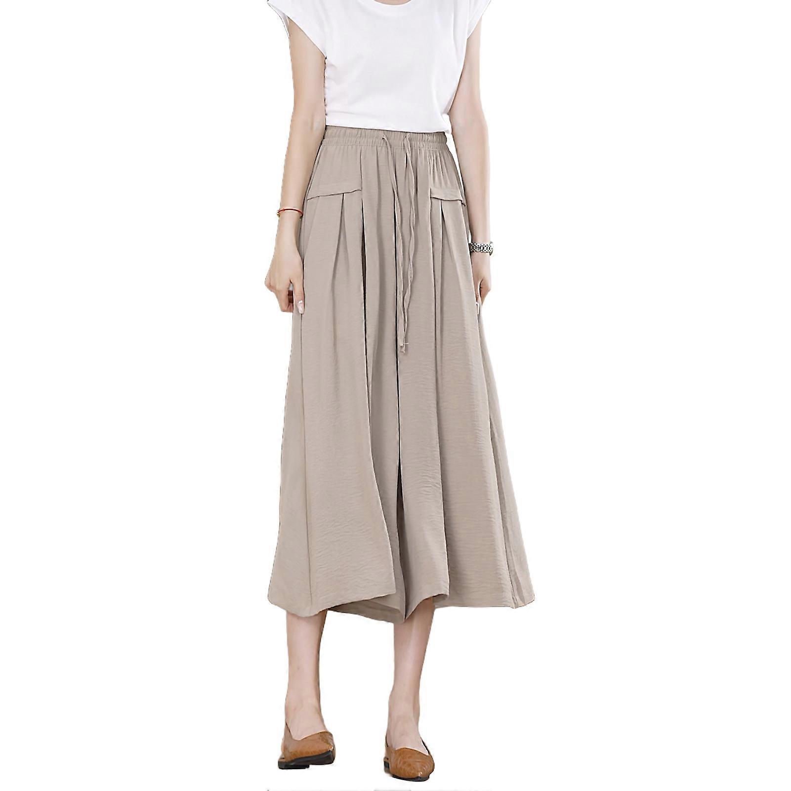 Women Cropped Pants Solid Color Wide-Leg Elastic Waist Casual Trousers with Pockets Loose Fit Pants