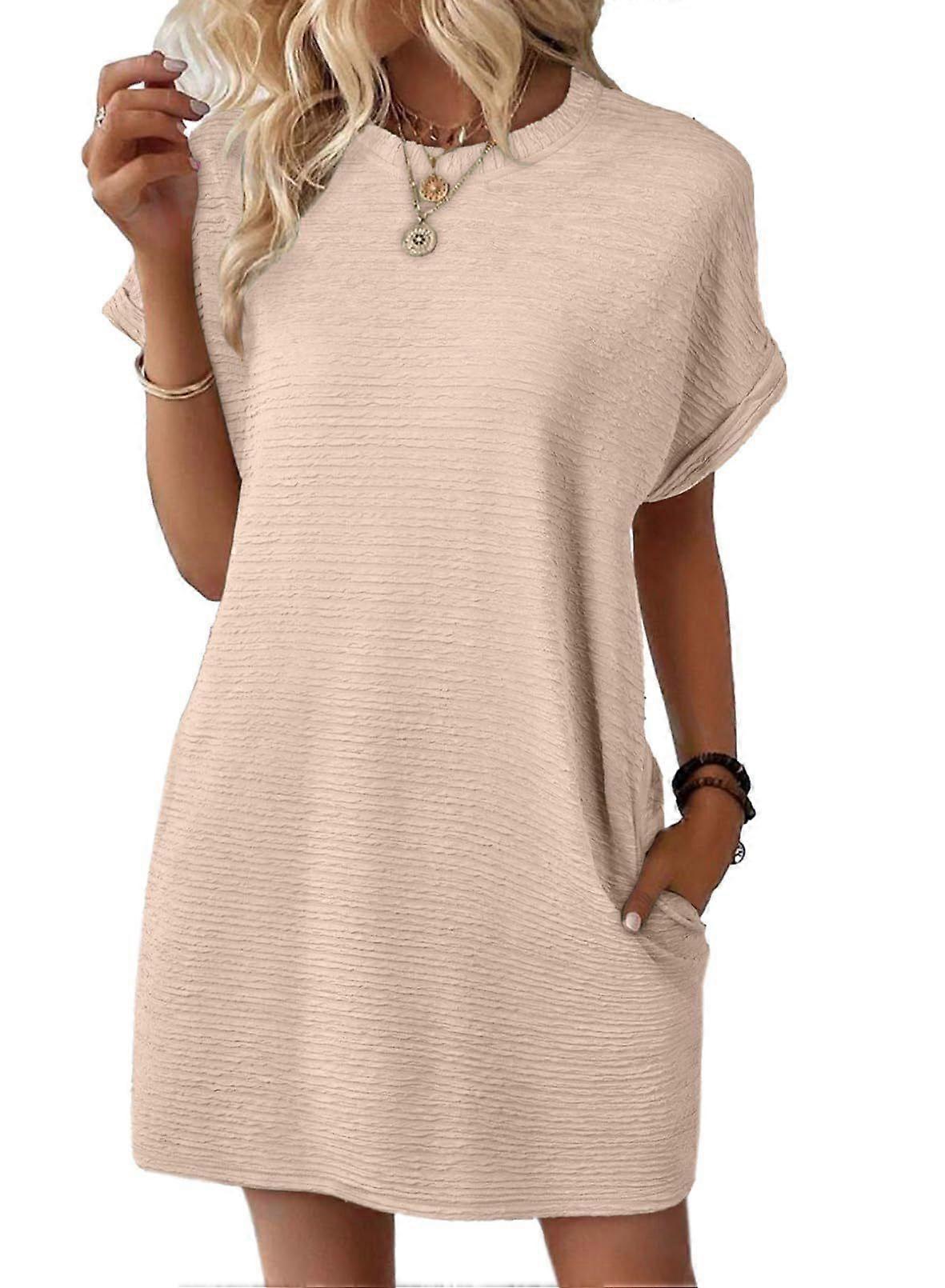 Summer New Loose Crew Neck Pocket Solid Color Short Sleeve Dress For Women