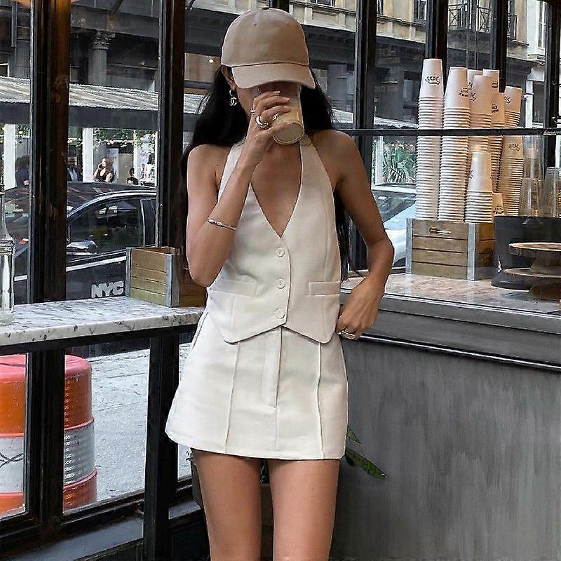 Women's Summer Fashion: A-Line Skirt Set With Faux Pockets, Suspenders, And A Stylish A-Line Top