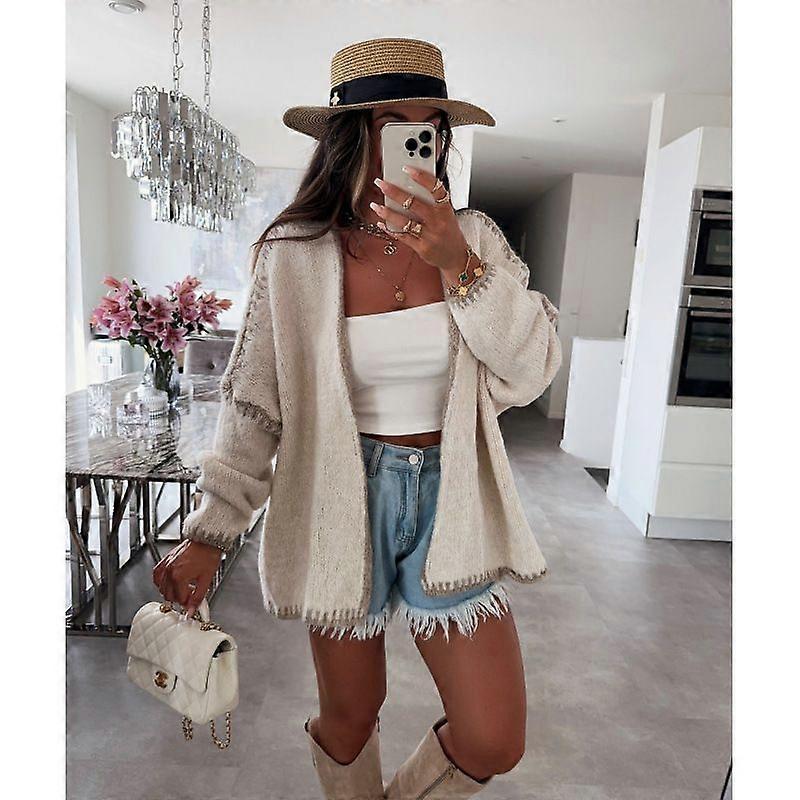 Women's Knit Cardigan With V-Neckline For Autumn/Winter, Loose-Fitting And Versatile, Featuring College-Style Color Contrast, Available In Early Autum