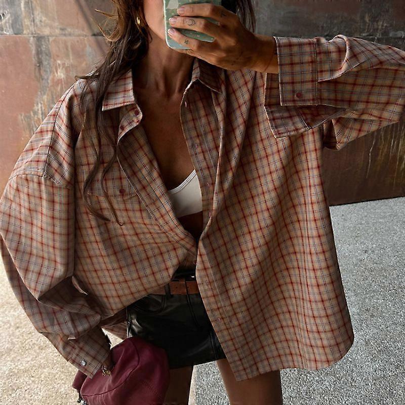 Loose Retro Plaid Long-Sleeve Women's Shirt With Stylish Design And Chic Casual Commuting Top