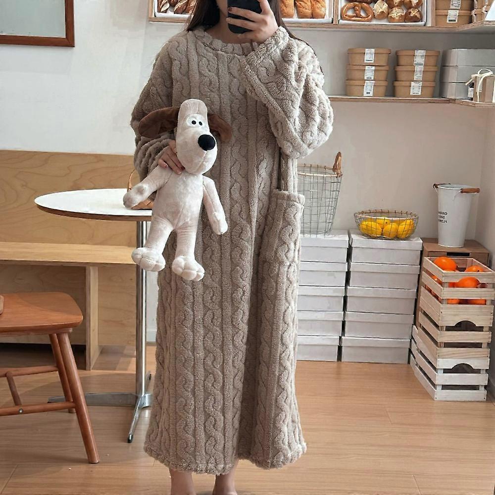New Thicken Warm Soft Night Dress Solid Color Comfort Long Sleeve Nightgowns Double Pocket Coral Velvet Winter Sleepwear