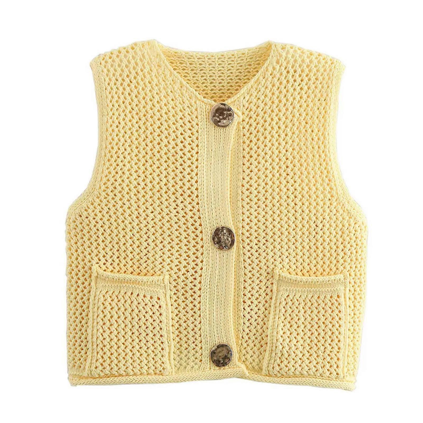 Women Knitting Vest V-Neck Sleeveless Single-Breasted Pocketed Knitting Waistcoat Versatile Solid