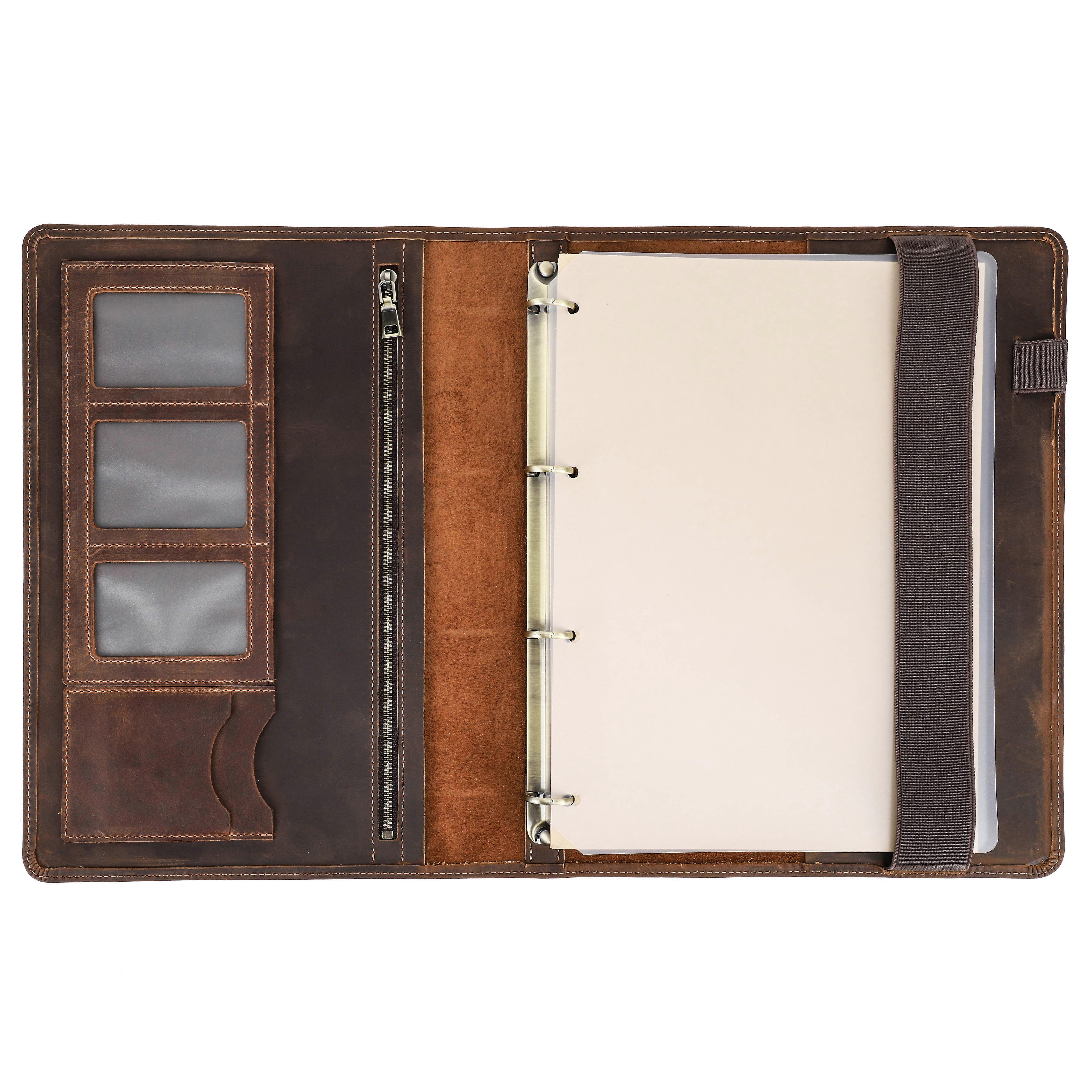 Luxury Retro Business A4 Notebook Leather Cover Portfolio with 4 Ring Binder Paper Ipad Pro 11 Holder Pen Card Slots Travel Case