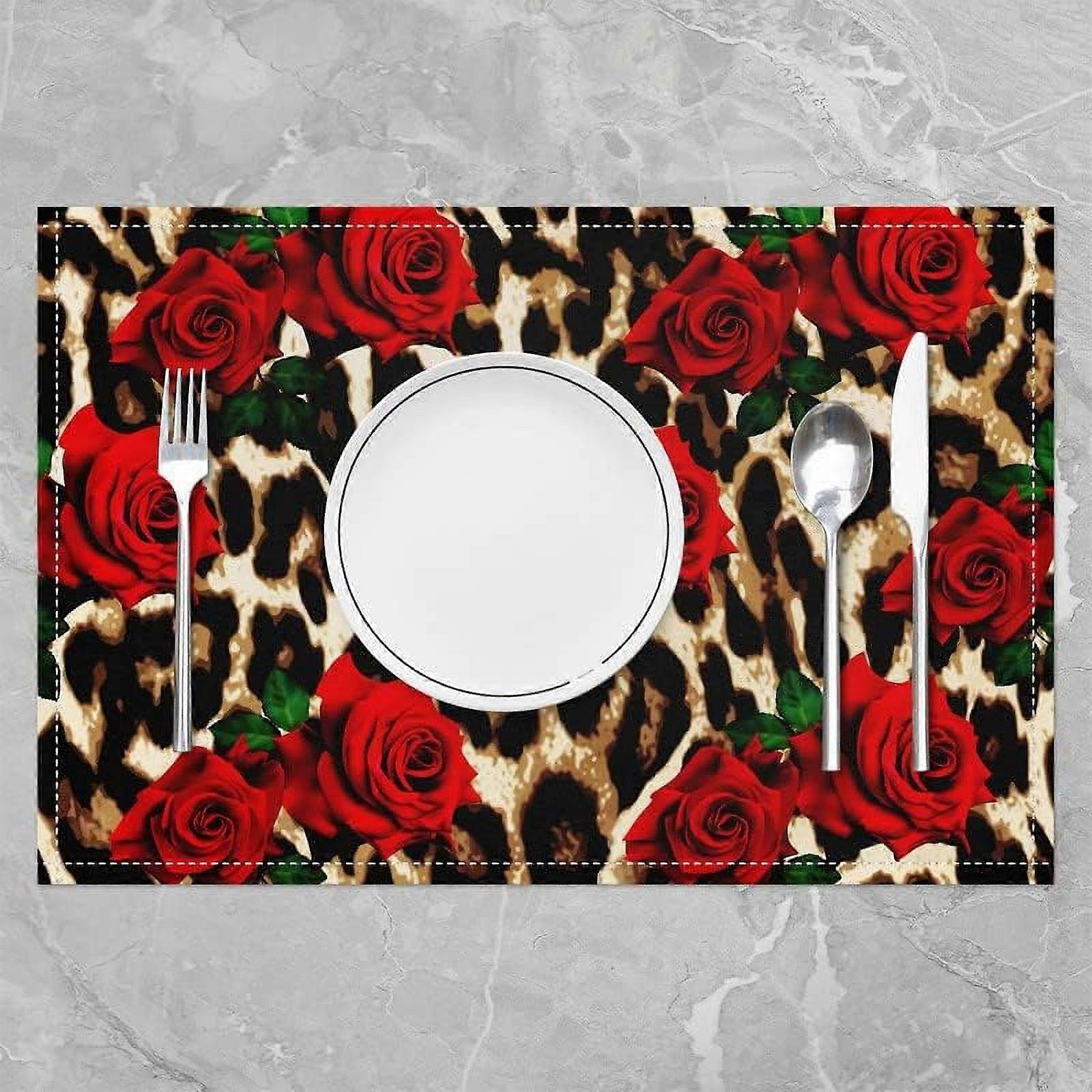 Leopard Print Placemats 18"x12" Set of 4 Soft Cheetah Rose Flower Washable Fabric Decorati