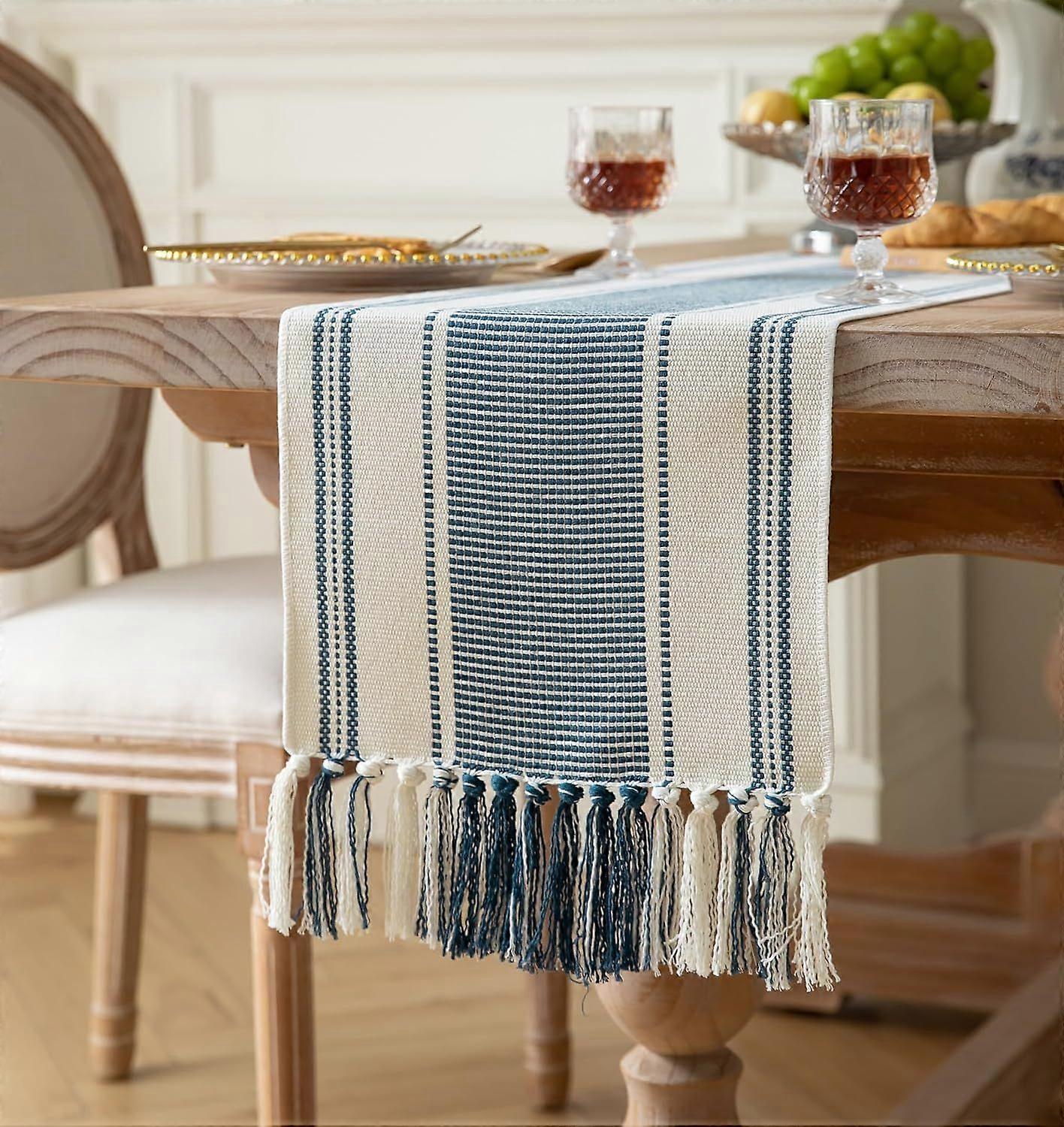 Bohemian Table Runner, Blue and White for Modern Farmhouse Decor, Natural Cotton
