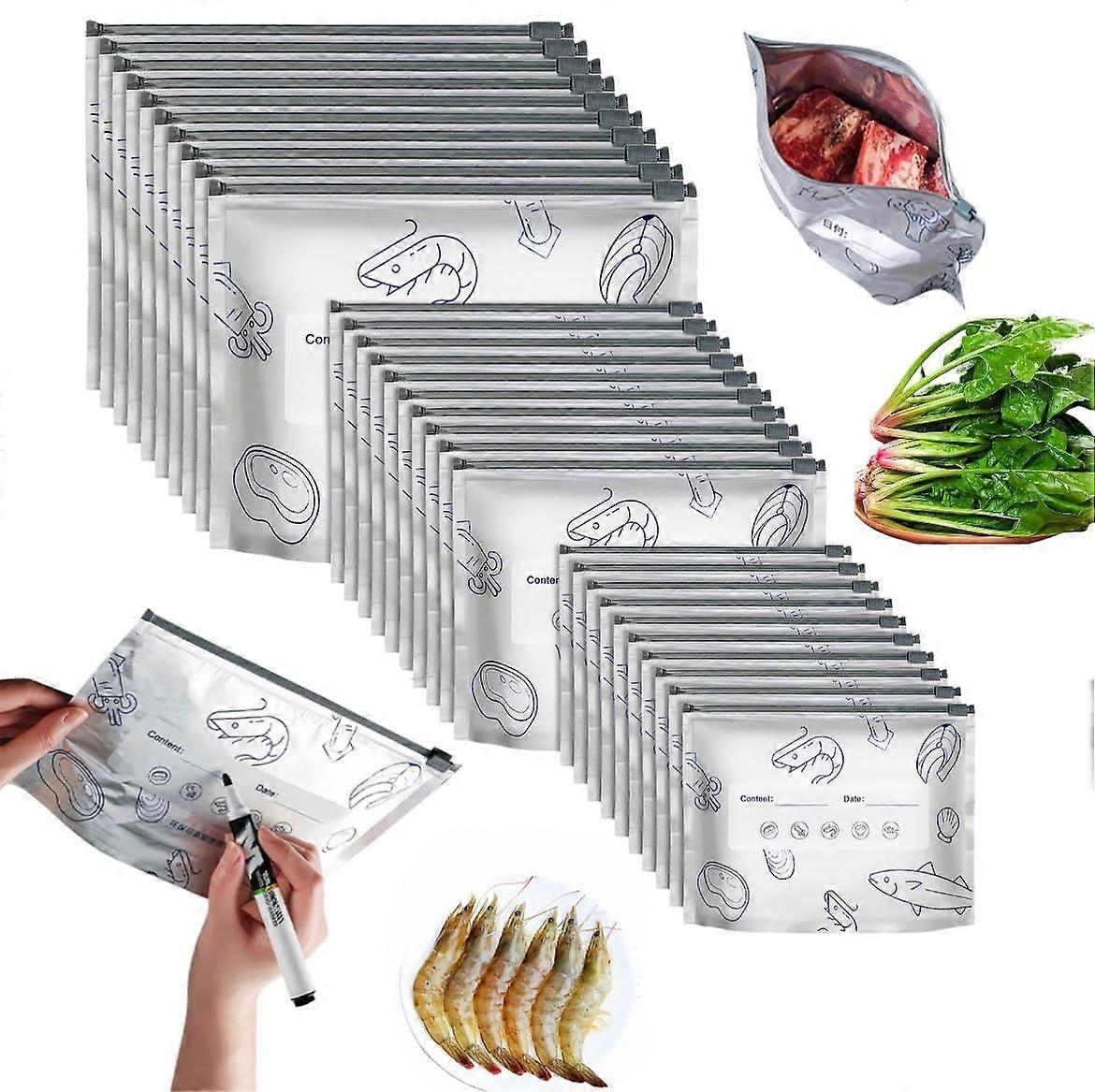 30PCS 3 Size 2026 New Resealable Vacuum Zipper Pouches for Food, Reusable Aluminum Foil Sealable Storage Bags with Label for Vegetable Fruit Meat
