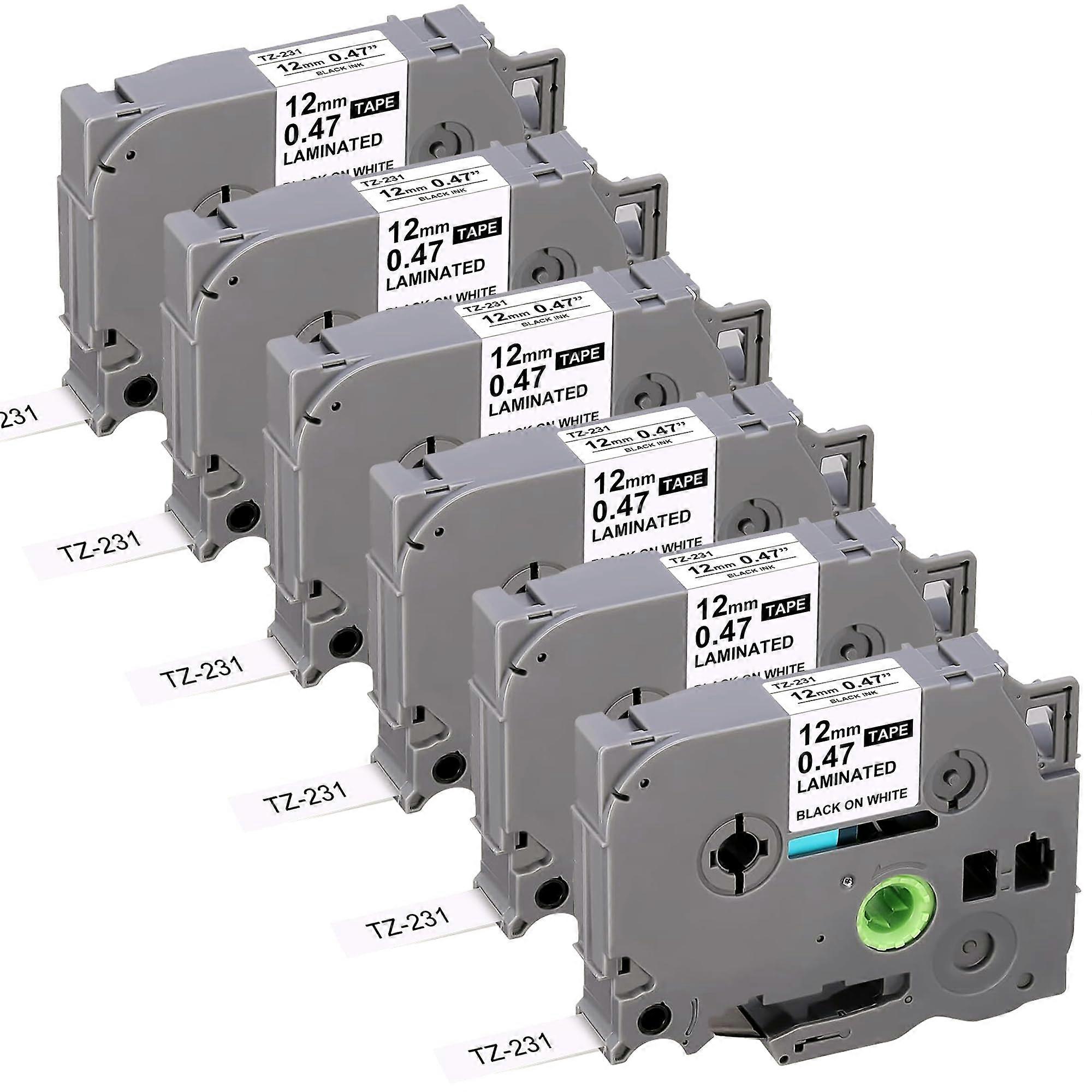 6Pack Label Maker Tape Compatible with Brother TZe231 12mm Black on White Compatible Ptouch Durable Waterproof