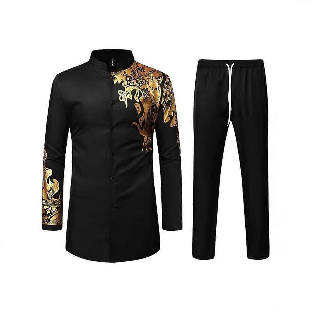 Men's African Dashiki Suit 2 Piece Embroidered Shirt and Pants Metallic Gold Tribal XXL Black