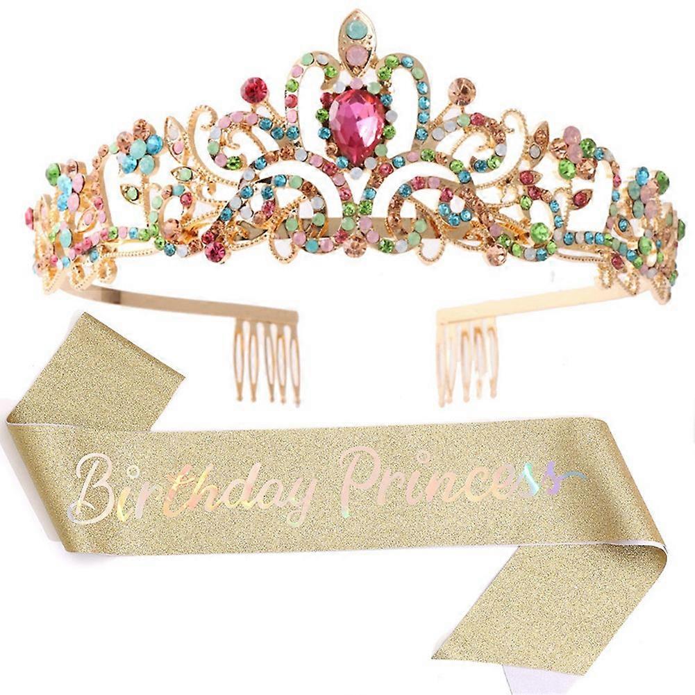 Birthday Girl Tiara Crown Princess Crown with Birthday Sash for Women Happy Birthday Party Supplies Multicolor+Gold