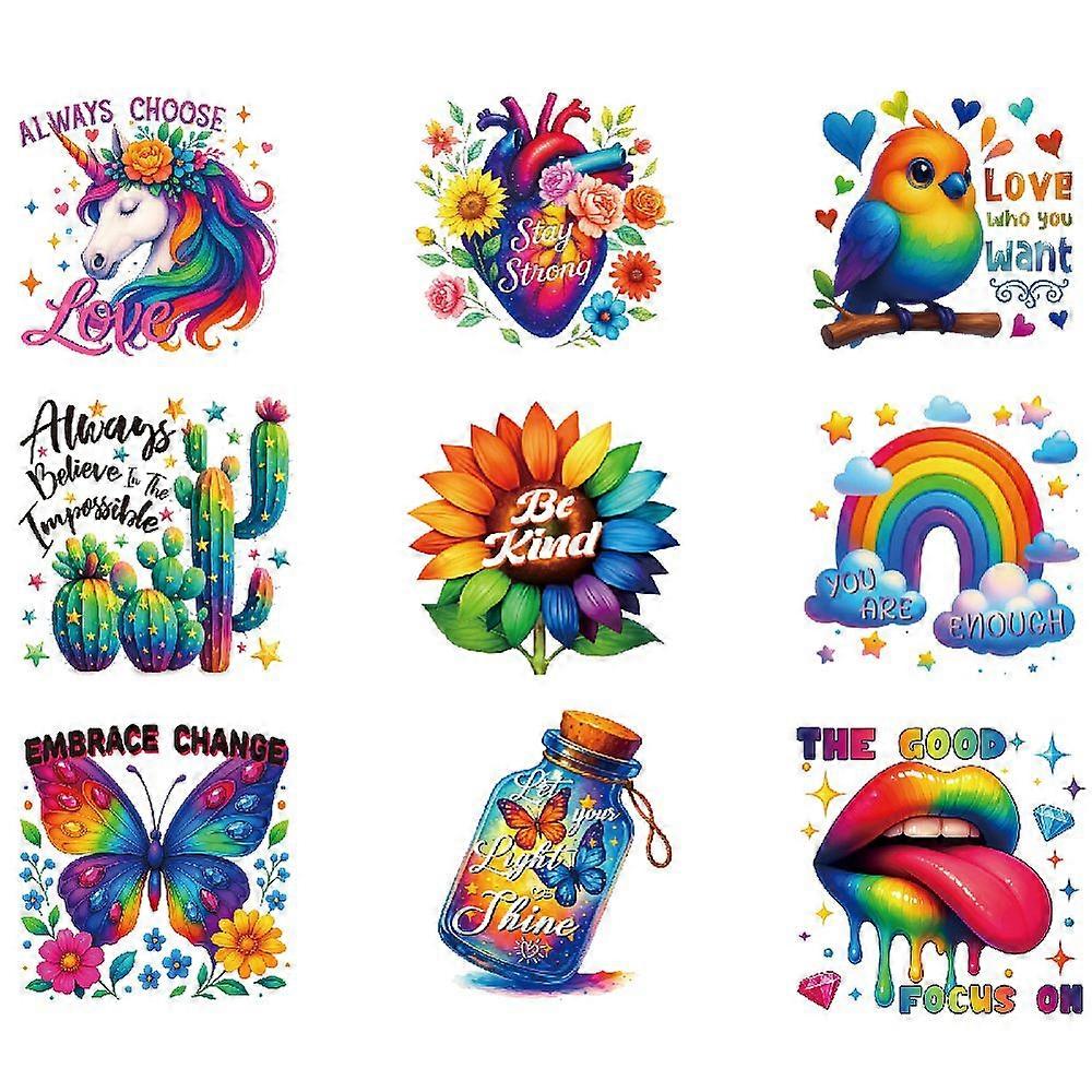 9pcs 9 styles Plastic Heat Transfer Film Logo Stickers set for DIY T-Shirt Mixed Shapes 80x65~80mm 1pc/style