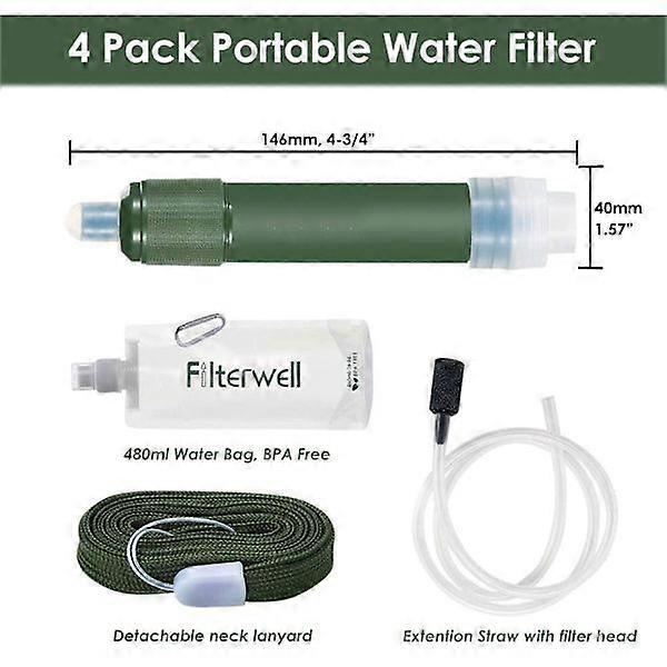 Water Purification System, Portable Water Filter Camping 0.01 Micron Absolute Hollow Fiber Membrane Water Purifier Pump - Water Filtration System Outdoor Emergency and Survival Equipment, Army Green This outdoor water filter with hand press has a filter precision of 0.01 microns and can effectively remove the bacteria in the water to provide clean, safe water. It is perfect for outdoor emergencies, camping, hiking, backpacking, etc. Specifications: Name: Outdoor Survival Portable Camping Water Filter Product Material: ABS + PP Product Size: 78 x 45 x 150 mm Filtered Water Capacity: 4500 L Filter Media: Hollow Fiber Membrane + Activated Carbon Fiber Flow Rate: 300 ml per minute Features: 1. This is a high-tech portable outdoor water purifier. It purifies wastewater into drinking water with super cleaning performance! 2. It can effectively remove 99.99% of E. coli and parasites that cause common diarrheal diseases. 3 Using the new "ultrafiltration membrane technology", the water purification efficiency is improved, no chemical medium is used to purify the water, and it is harmless to the human body. 4 Water filters are mainly used to provide safe and clean drinking water during natural disasters (such as floods, earthquakes, hurricanes, etc.), and can also be used for outdoor survival, camping, picnics, travel, etc. 5 With clean drinking water outdoors, you will have a better living space. It is an essential survival product for outdoor travel. This includes: Water filter x 1 water pipe x 1 1 x manual ?Fast and efficient portable water filter? - The 3,000L portable personal water filter for outdoor use can remove 99.999% of bacteria and heavy metal in 0.5s. Built with 0.01 micron ultrafiltration membrane, giving you a reliable source of clean drinking water anytime, anywhere. ?Food Grade Material?- Made of strong food grade plastic, using the advanced coconut shell activated carbon filter, this carbon filter purifies to 0.01 microns and eliminates many impurities to provide you with clean and pure water. The outdoor personal water filter is very easy to clean. ?Easy to Use?- The portable mini outdoor water filter is equipped with a multifunctional silicone adapter, which can be connected to mineral water bottles, water storage bags, faucets, etc. You can also drink directly from the water source with the included extension straw. ?Emergency Survival Equipment?: In the event of a natural disaster or emergency, finding clean drinking water is crucial. When you can't find a clean and hygienic water source in nature, the camping water filter is your reliable survival tool for wild drinking water. The human body is safe and durable. ?Convenient to carry?: Our emergency water filters have a lanyard and a storage bag so you can take them anywhere. It is very suitable for outdoor adventures, emergency preparedness, camping, hiking, reconnaissance, outdoor travel and so on.
