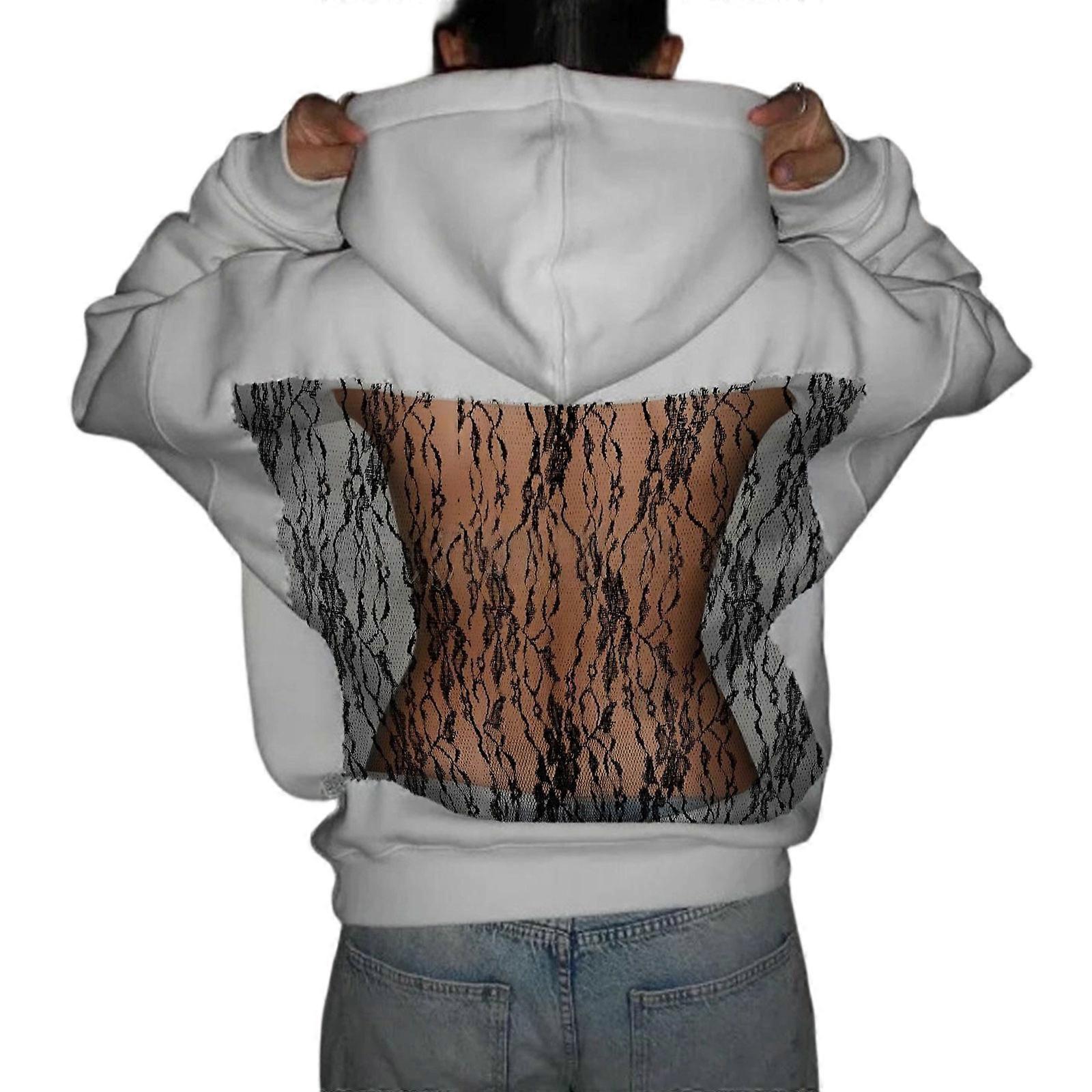 Women's Solid Color Hooded Sweatshirt with Mesh Backless Design Sheer Hollow Back Loose Fit Casual Hoodie Pullover Top lace white XL