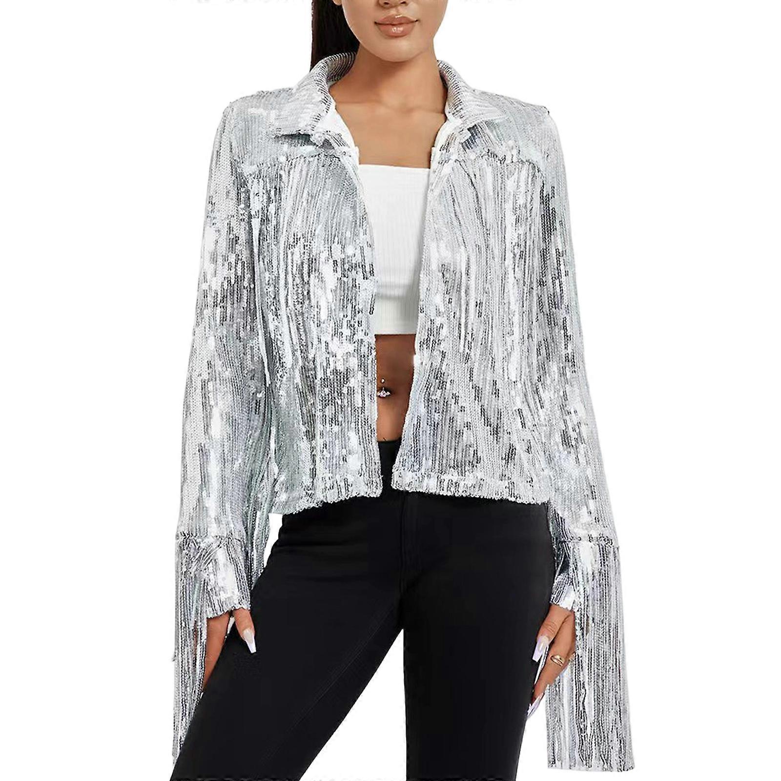Stylish Shimmering Fringe Coat For Women Dazzling Decorative Jackets Comfortable Polyester Fabric Great For Celebrations Silver XL