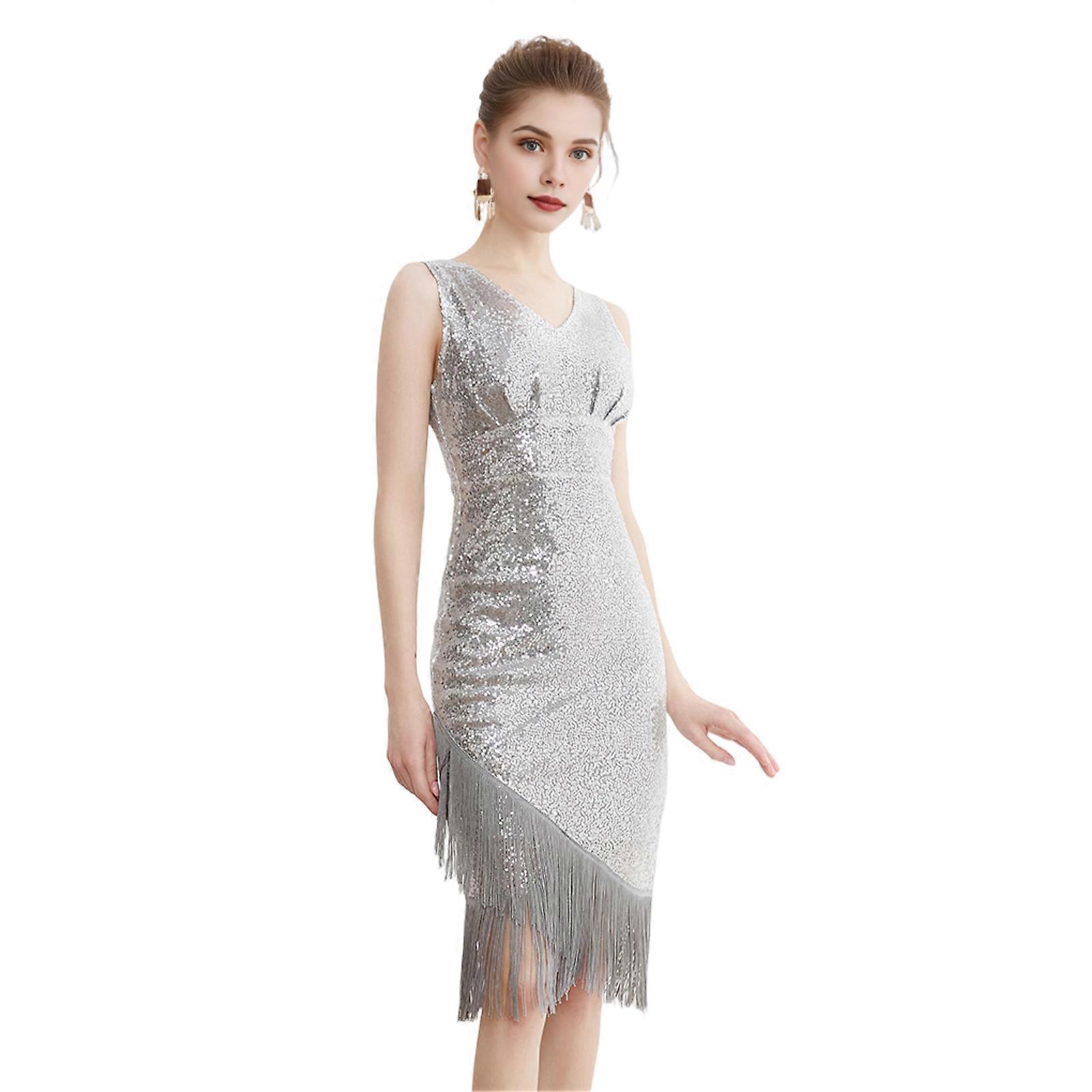 Women Evening Dress Sleeveless Tassel Hem Slim Fit V Neck Sleeveless Sequin High Waist Midi Dress