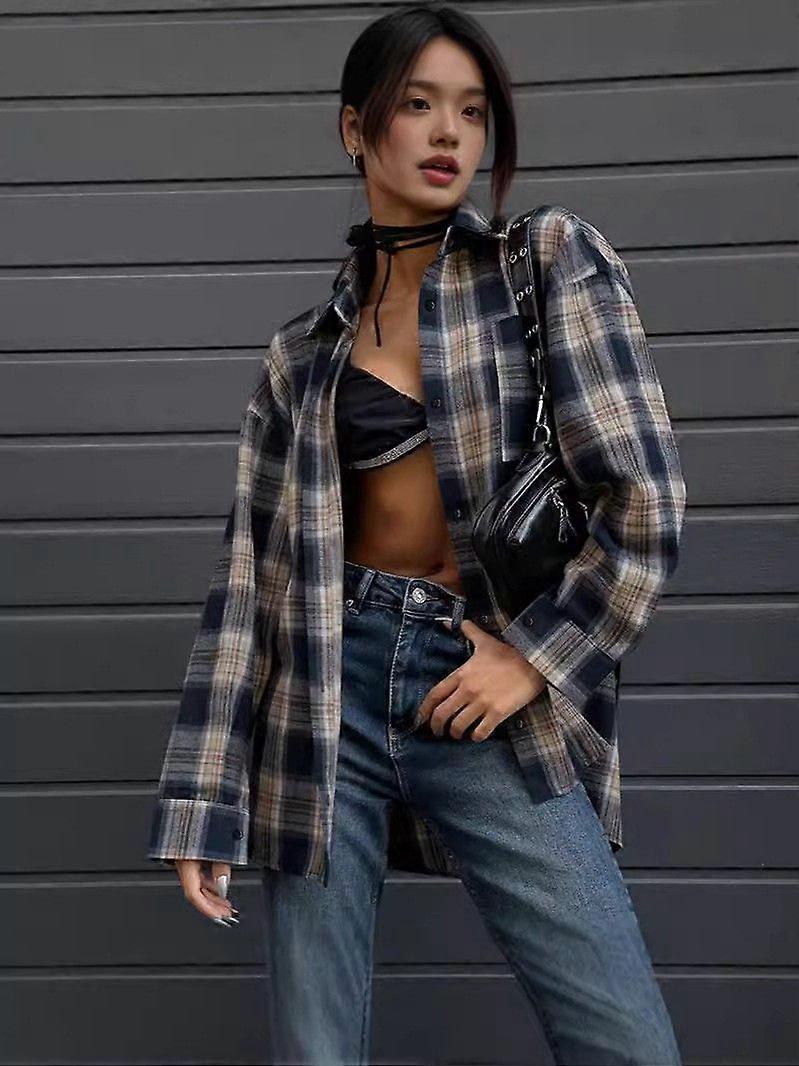 French Retro Plaid Shirt For Commuting, Casual Streetwear Style, Women's Autumn/Winter Wear