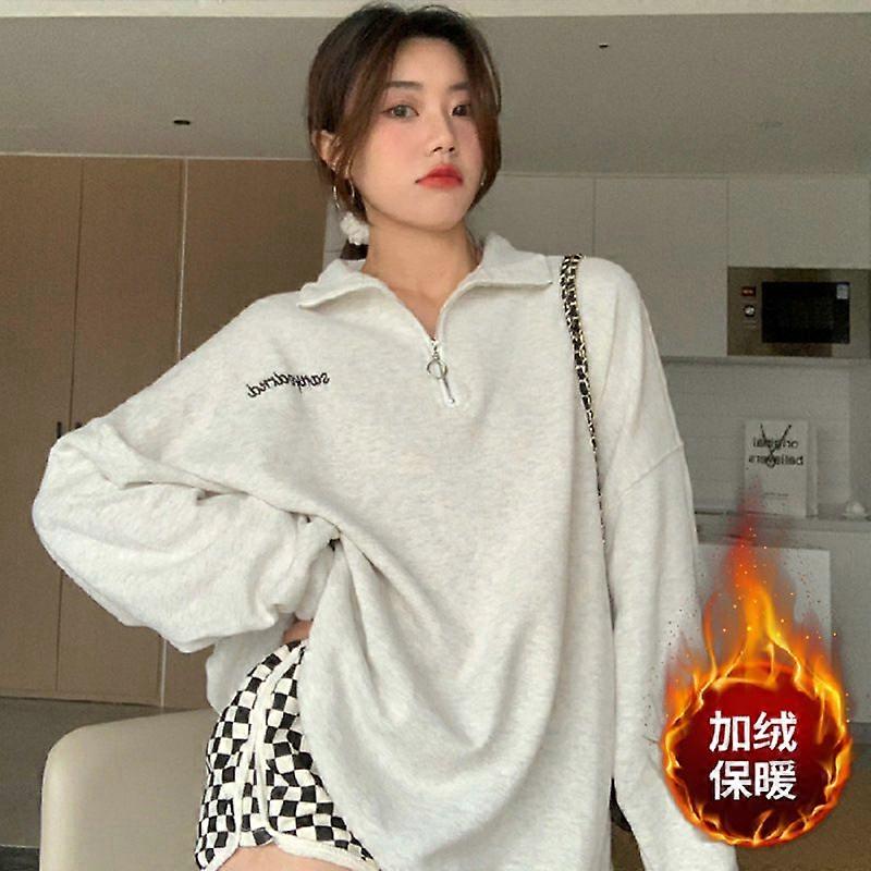 Autumn And Winter Letter-Embroidered Bf Style Large-Sized Loose Mid-Length Stand-Up Collar Fleece Hoodie For Women With Zipper Pullover