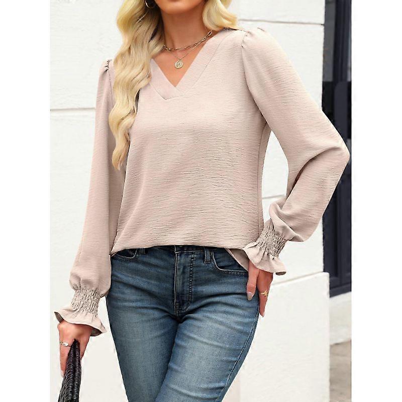 Ice-White Ruffled Solid V-Neck Bubble-Flared Long-Sleeve T-Shirt, Women's Size 3/4