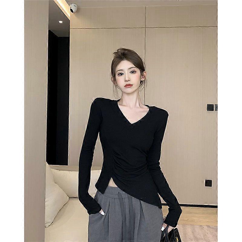 A Versatile Long-Sleeved Top With Irregular Pleats For Autumn And Winter, Designed To Conceal Body Curves While Enhancing Slimming Effects And Adding