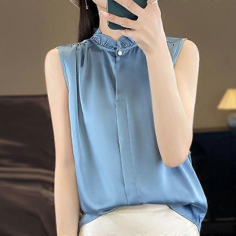 Women's Spring/Summer Slimming Flannel Collarless T-Shirt With Lace-Trimmed Collar And One-Button Back, Pure Color, Slimming Design