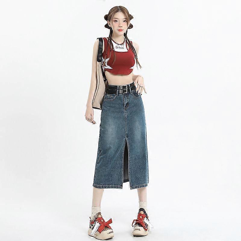 Slit Denim Skirt, Women's Skirt, Summer High-Waisted Slimming A-Line Skirt, Mid-Length Side, Versatile Large Skirt