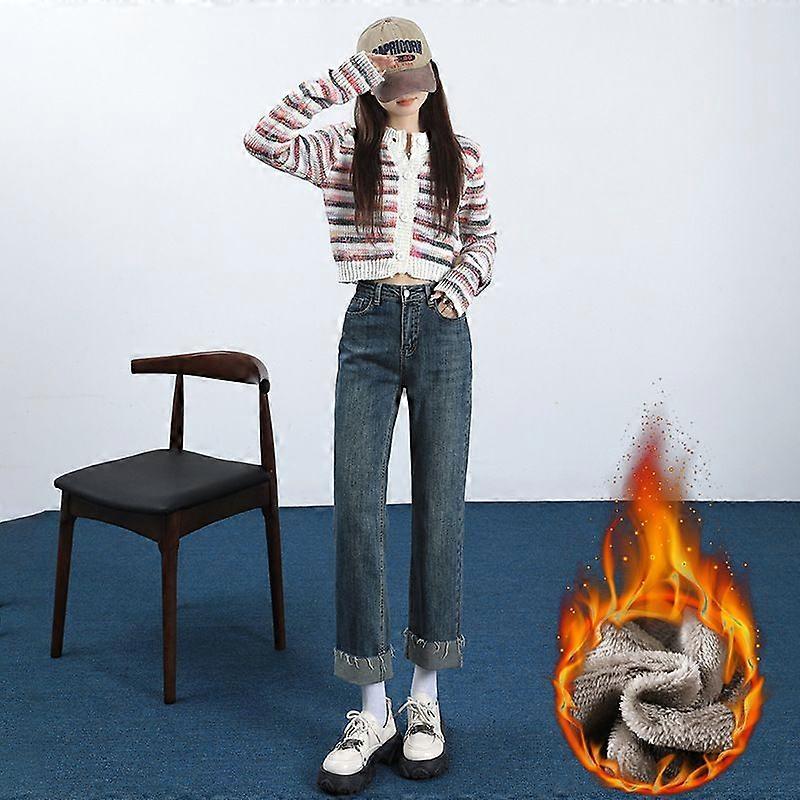 High-Waisted Rolled-Edge Straight-Leg Jeans For Women Fall/Winter Style With Relaxed Fit That Flatters Petite Figures, Featuring Fleece-Lined Smoke P