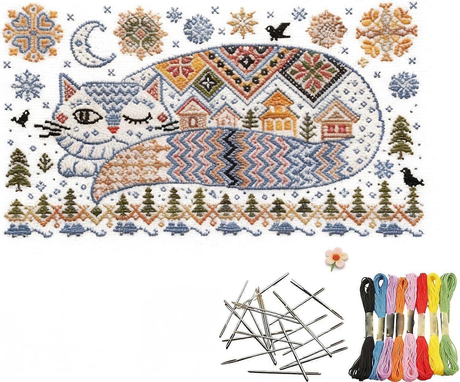 Winter Town Cat Cross Stitch Kit, Nordic Style Cat Silhouette with Snowflakes, Moon, Cottages and Pine Trees, Beginner-Friendly DIY Embroidery Set, Ca