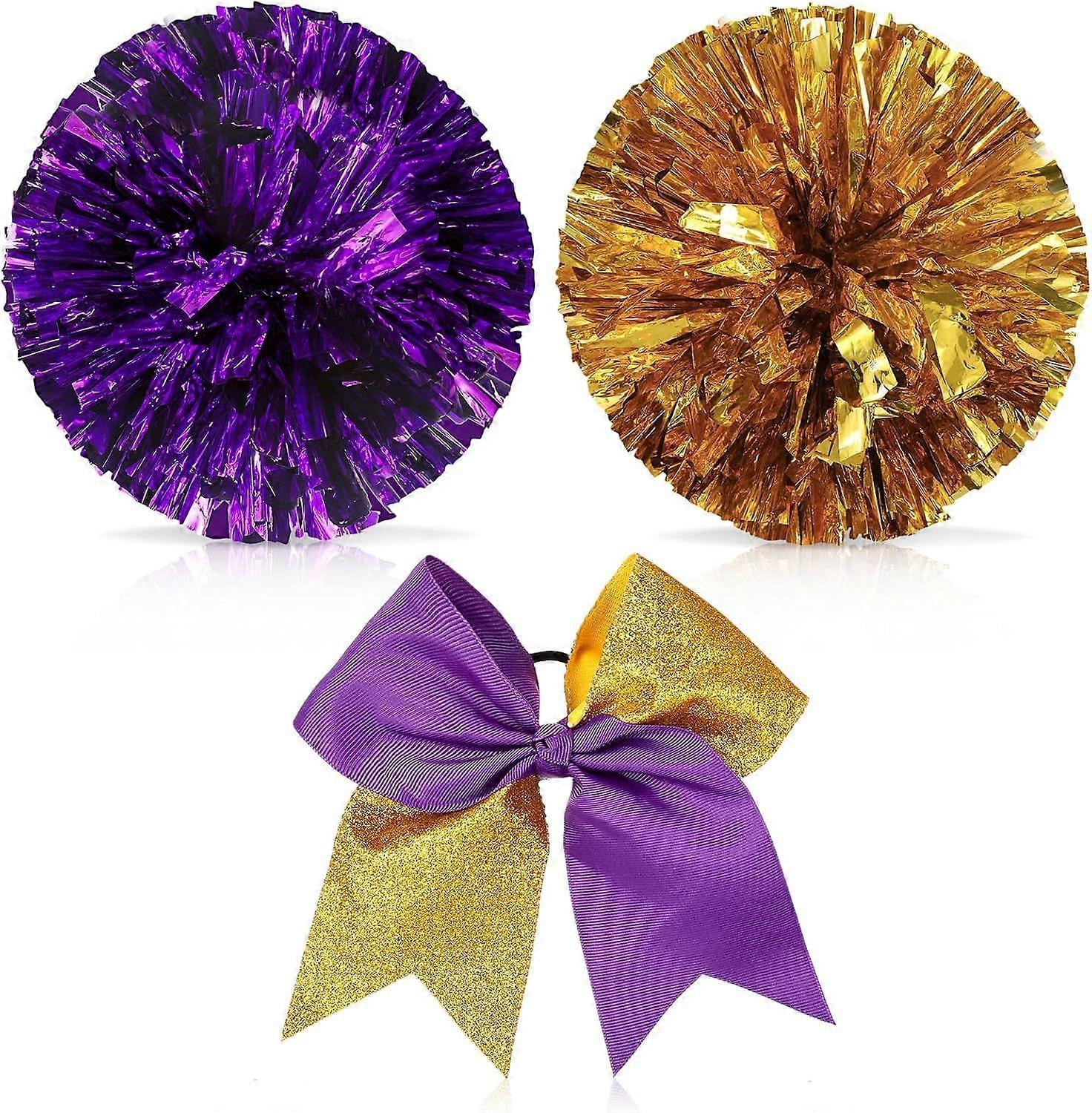 Set of 3 12 Inch Cheerleading Pom Poms and Large Cheerleader Ponytail Bow Holder