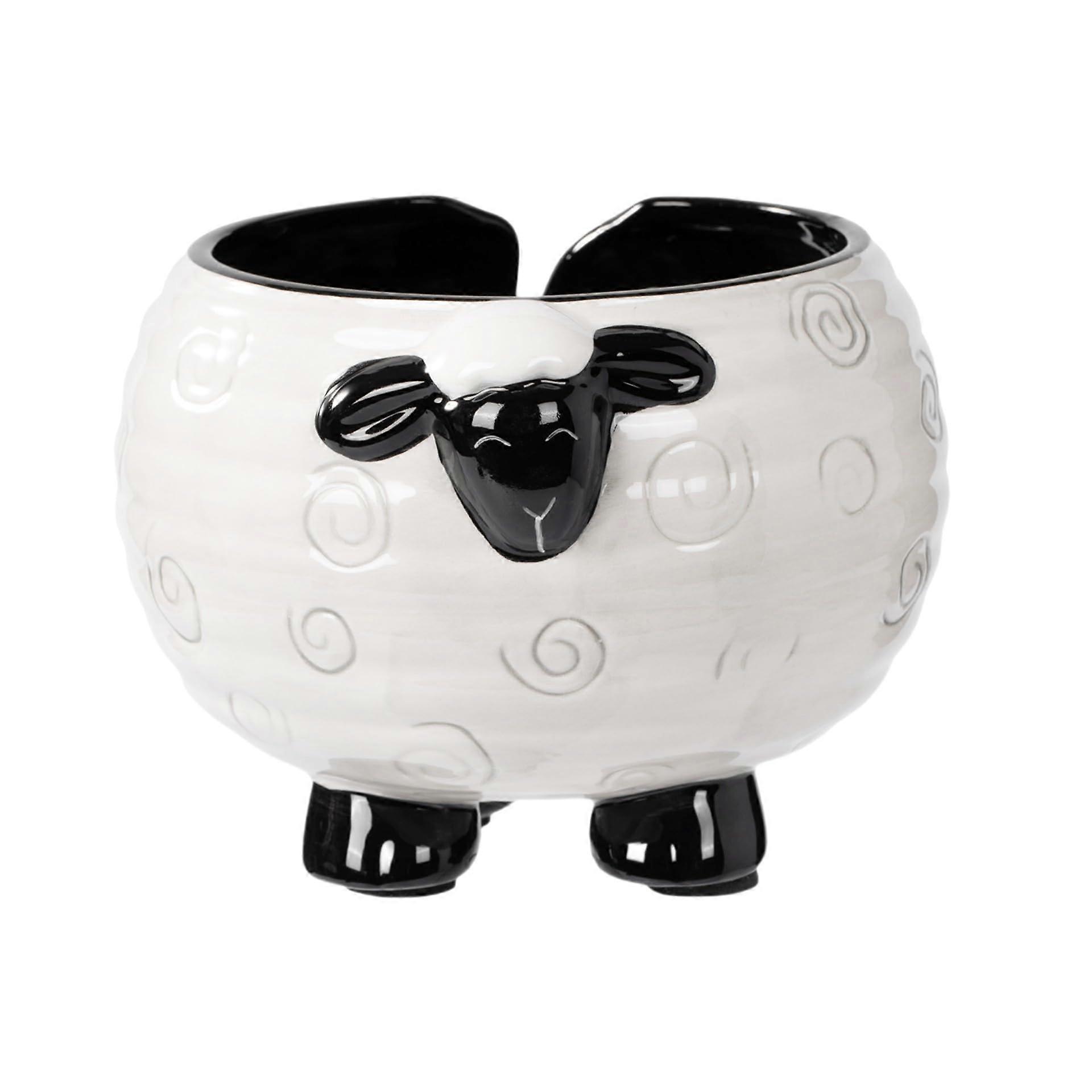 A decorative, functional ceramic yarn bowl shaped like a sheep that keeps your yarn tidy and feeds smoothly during knitting and crochet projects. The exterior is white with spiral patterns and black accents for the legs and face. Built for steady performance and long term use.