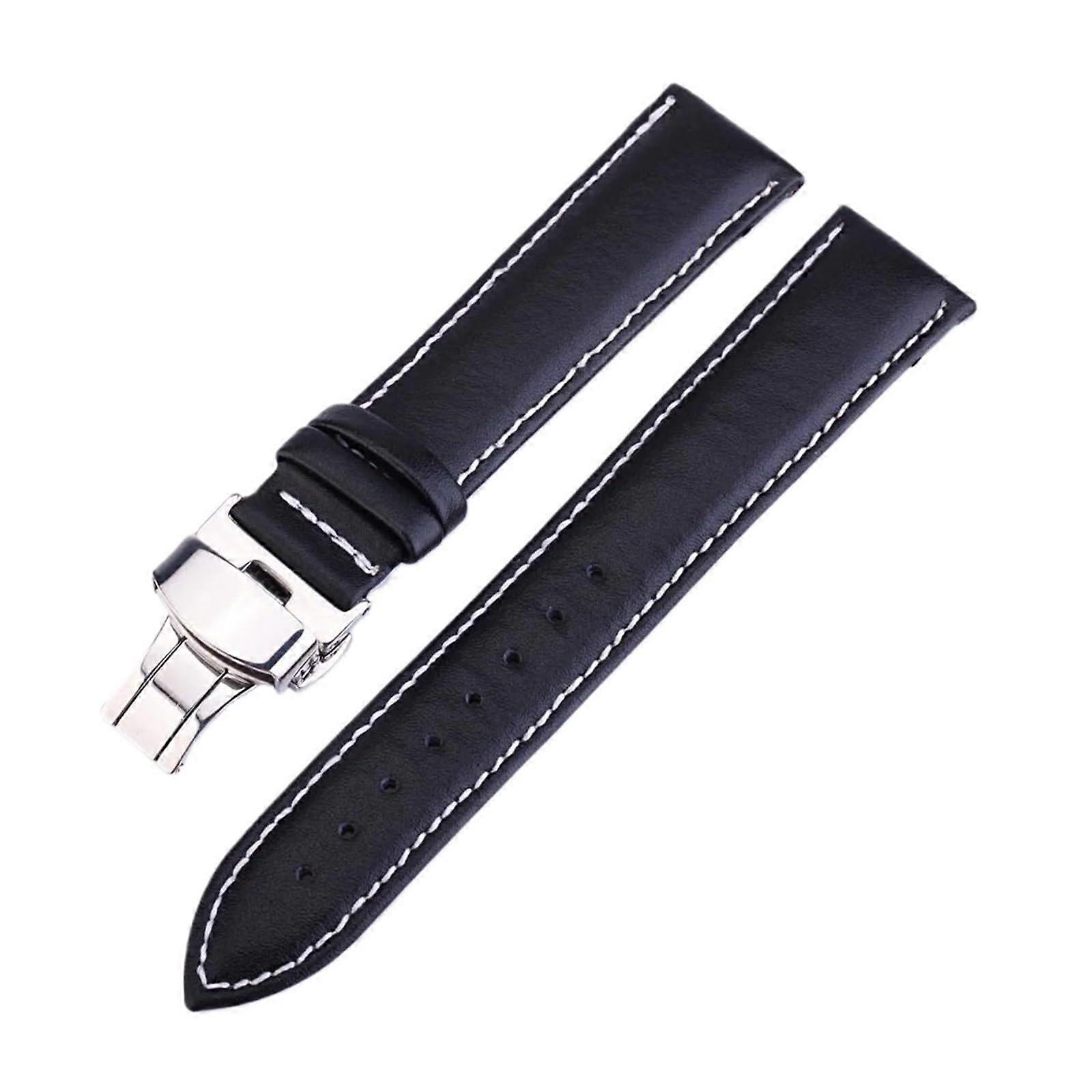Black Leather Watch Strap 20mm Leather Band with Butterfly Buckle and White Stitching