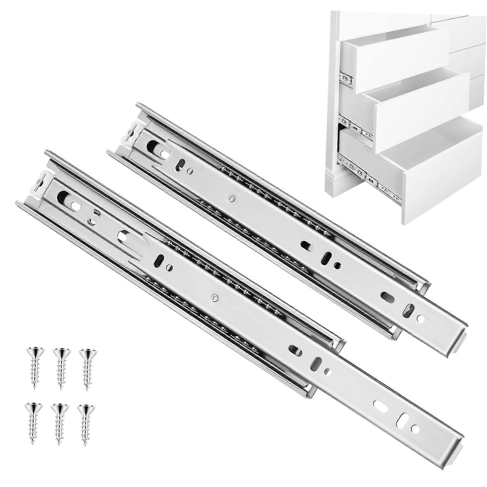 Product overview A 10 inch full extension drawer slide designed for or installation of furniture drawers. Made from 304 stainless steel for strength and wear resistance, this locking drawer slide supports heavy loads and provides smooth sliding performance for a variety of cabinetry and furniture applications. Key benefits Full extension design lets drawers open completely for easy access to contents. loadbearing capacity supports heavy drawers and keeps them stable during use. Durable 304 stainless steel construction offers strength and long service life. Locking mechanism secures the drawer in place when closed or when extended, reducing accidental opening or rattling. Multiple screw holes and included screws simplify installation and ensure a secure fit. Features Size: 10 inch length, suitable for many standard drawers and cabinet sizes. Mounting compatibility: suitable for bottom mount and undermount setups, and usable with side mount ball bearing installations. Sliding system: ball bearing action for smooth, lowfriction movement and reliable full extension. Material: 304 stainless steel, strong, sturdy, wearresistant and longlasting. Installation: predrilled screw holes and included screws make mounting straightforward for both repairs and installations. How this product solves common problems Eliminates sticking and uneven sliding in worn or damaged drawers by replacing old slides with a full extension, ball bearing system. Handles heavy loads that cause cheaper slides to bend or fail, increasing drawer reliability. Locks drawers to prevent accidental opening during movement or transport, improving safety and usability. Typical applications Kitchen cabinets and large utensil or cookware drawers where full access and load capacity are required. Workshop or garage tool chests and storage drawers that need durable slides for heavy tools and parts. Office filing cabinets and furniture drawers that benefit from smooth full extension and secure locking. What you get One 10 inch full extension locking drawer slide assembly. Multiple screw holes and a set of screws for quick installation. This drawer slide combines durable materials, load capacity, and a locking full extension mechanism to improve drawer function and longevity in residential and light commercial settings.