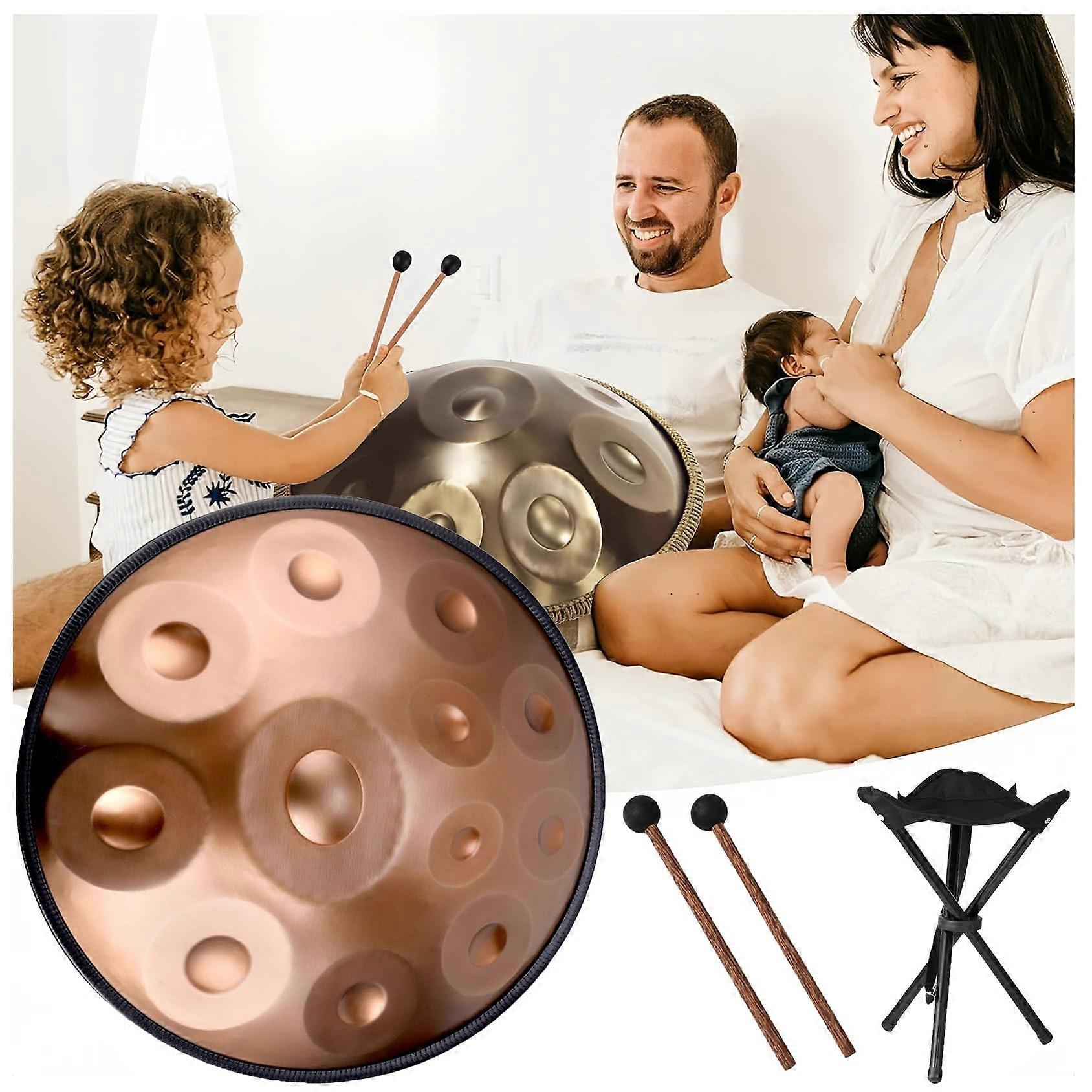 Handpan 12 Notes 432Hz, 22 Inch, Gold Key benefits Consistent, musical tuning: 12 notes tuned to 432Hz provide a warm, centered scale suitable for composition, performance, and practice. Rich resonance and clarity: Each tone has been handtuned and tested for strong, sustained vibration and clear timbre. Durable, travelready construction: Built from nitrided steel with protective edge coating and heattreated to remain stable under repeated play and transport. Playable and versatile: 22 inch size fits comfortably on the thighs for twohanded playing and is suitable for studio work, live performance, or outdoor use. Product features Notes and tuning: 12 Notes tuned to 432Hz for a balanced, musical scale. Size and color: 22 inch diameter, Gold finish. Material and construction: Made from 1.2 mm thick nitrided steel plates, quenched and heat treated to improve tonal stability. Edges are coated with protective plastic to reduce wear. Hollow interior and convex lens shape for acoustic projection. Handcrafted details: Each instrument is handmade; you may notice subtle traces of manual thumping that mark its artisanal production. Professional tuning: Every sound hole is carefully crafted and handtuned by professional tuners, with extensive fine tuning to ensure consistent resonance across all notes. Performance and use Strong resonance: Notes display sustained vibration and balanced overtones across the scale. Comfortable playability: 22 inch size allows for natural twohanded technique while resting on the lap. Portable design: Sturdy, lightweight construction suited for carrying to rehearsals, gigs, or outdoor sessions. Practical applications Solo practice and composition: Use on the lap for focused practice, songwriting, and melodic exploration. Live performance and busking: Compact size and robust tuning make it suitable for small venues, street performance, and ensemble settings. Recording and studio sessions: Stable tuning and clear resonance make it a reliable choice for capturing clean, musical tones in studio recordings. What sets this instrument apart Industrialgrade nitrided steel and 1.2 mm thickness for dependable tonal quality and longevity. Heat treatment and quenching process applied to improve tonal consistency and sustain. Handtuned sound holes by professional tuners provide careful attention to pitch and resonance. Protective edge coating and hollow convex design enhance play comfort and acoustic projection. Specifications Notes: 12 Notes at 432Hz Diameter: 22 inch Color: Gold Material: Nitrided steel, 1.2 mm thickness Edge: Protective plastic coating Shape: Hollow interior with convex lens profile Package and care suggestions Store in a padded bag or case when transporting to prevent dents and scratches. Wipe clean with a dry, soft cloth after playing to preserve finish. Minor surface marks from handmade production are normal and do not affect sound quality.
