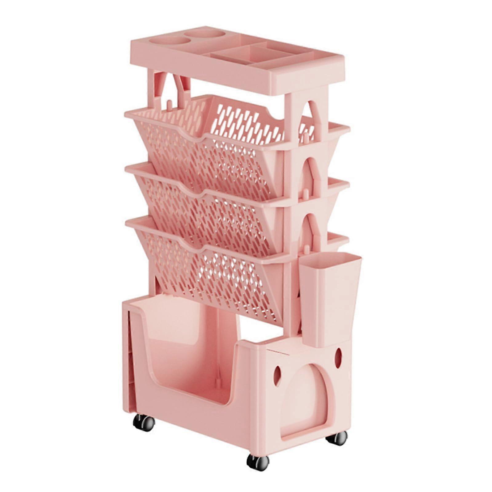 6Tier Rolling Book Cart with Wheels, Pink Movable Bookshelf for Office and Home, Durable Storage Design