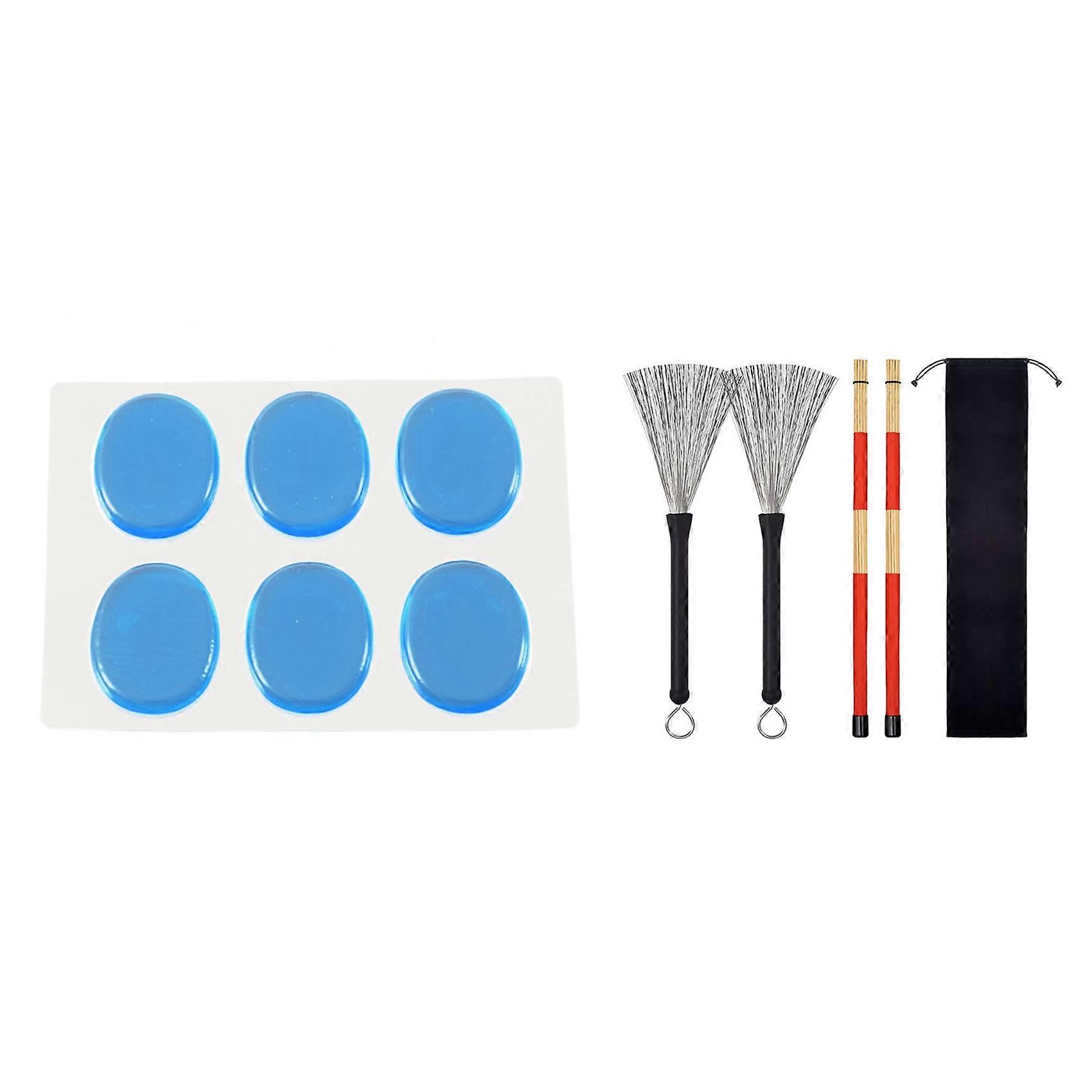 6x Snare Drum Mute Pad Drum Damper Gel Pads (Blue) & 1Pair Drum Brushes Retractable Wire Brushes Drums Drum Sticks Brush