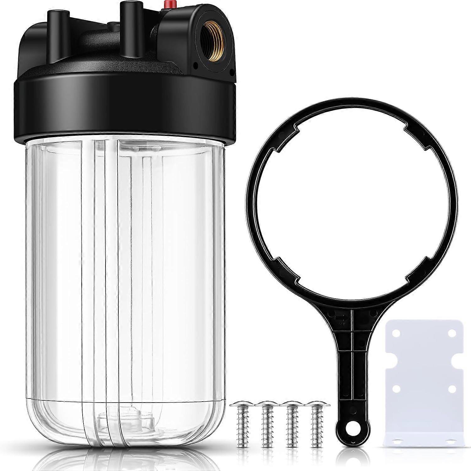Easy to install: Comes with all necessary installation tools, wrench, heavy-duty steel mounting bracket, 4 screws; Standard 1" NPT brass inlet/outlet fits most ports; Does not include filter cartridges and push-fit fittings Reliable material: The whole house water filter housing is made of PET material, which is pressure and corrosion resistant and ensures a safe and healthy water filtration experience Improved design: Compared to inline water filter housings, our filter housing The 10" x 4.5" water inlet is thickened and the port is upgraded to brass, and a double O-ring design is used to ensure there will be no water leaks after long-term use. Compatible Filter Cartridges: Fits standard 4.5" x 10" universal filters, such as sediment filter cartridges (PP10BB), sediment and carbon filter cartridges (PP10BB-CC), pleated filter element (PPL10BB), and carbon filter element (CTO10BB) DIY Inline Water Filter Box: You can get multiple filters Complete water filtration systems are installed in parallel (two or three stages) to achieve the desired filtration quality. Depending on your water quality, you can choose a sediment filter, a carbon water filter, etc. Note: Be careful during installation to avoid damaging the brass wires and causing more serious leaks. The built-in red pressure release button is used to release water pressure for easier filter replacement. The maximum rated pressure is 350 psi. Wide application: This filtration system can be placed in the main water pipe entering the house, protecting downstream pipes, water purifiers, water heaters, wall-mounted boilers, washing machines, shower heads and other terminal equipment and appliances