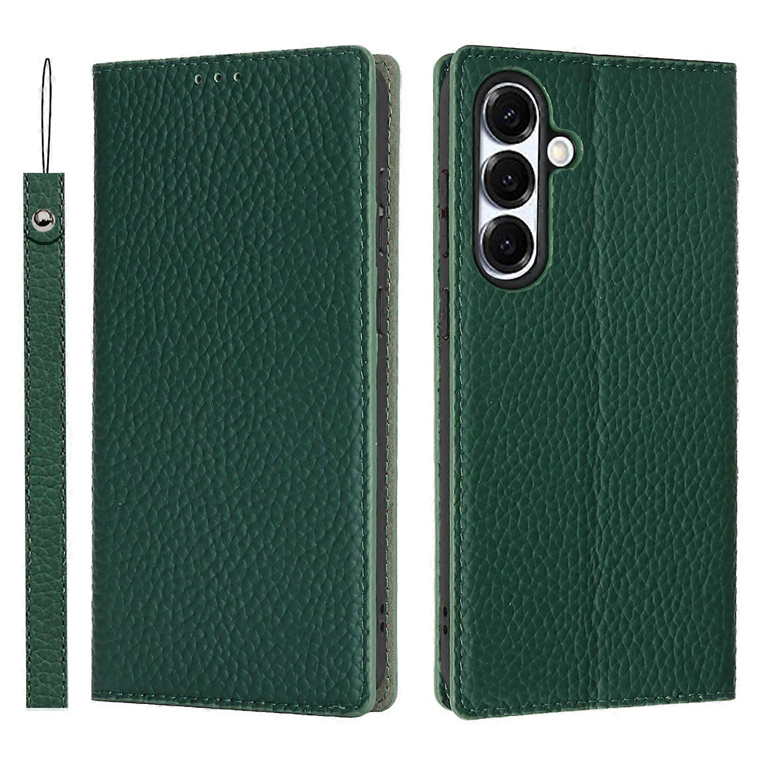 For Samsung Galaxy S25 FE Wallet Case Genuine Cow Leather Phone Cover Litchi Texture - Dark Green
