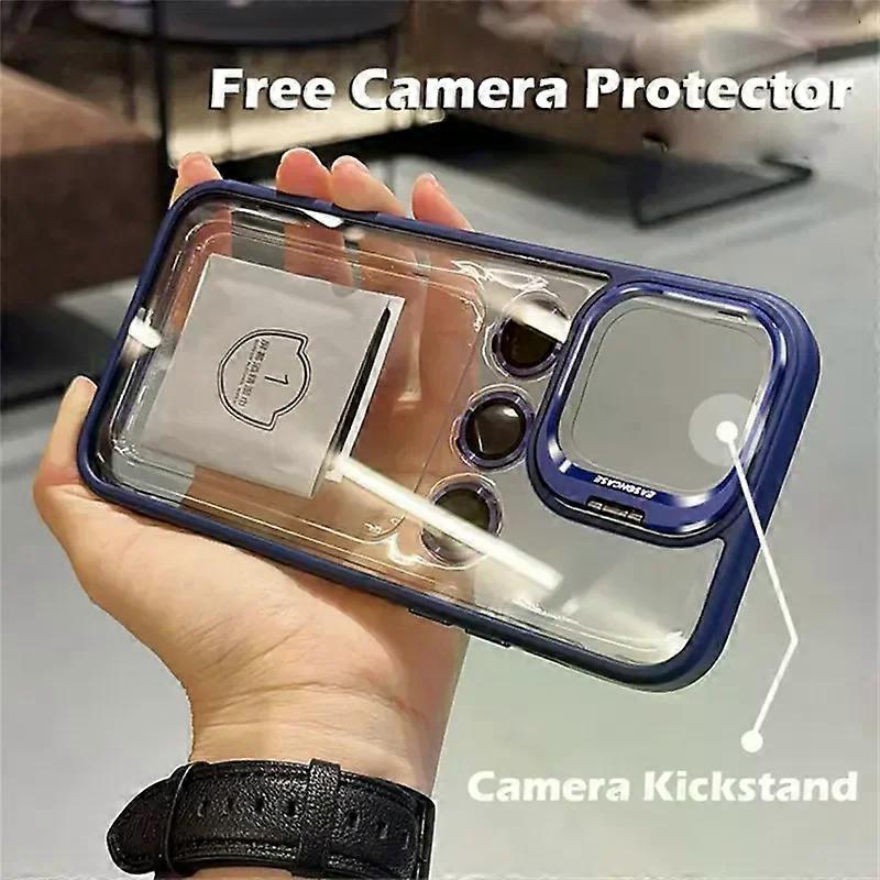 Luxury Metal Camera Lens Holder Stand Case For iPhone 15 14 13 12 11 Pro Max Plus Phone Transparent Soft Bumper Shockproof Cover