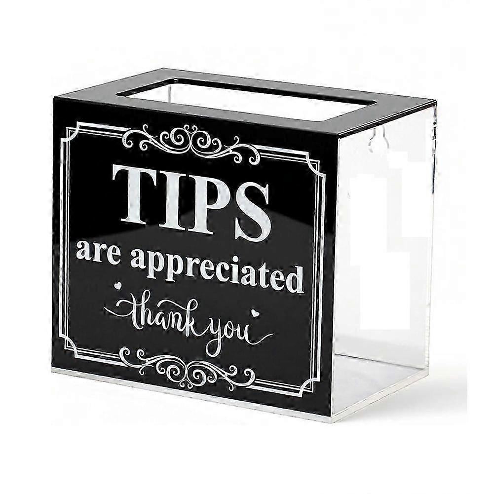 Acrylic Tip Jar for Money Donation Raffle Cash Collection Storage Box for Bartender Bars Restaurants Musicians Drive Transparent Design: This tip jar measures 6 x 4 x 5 inches with a 4.3 x 2.3 inch opening, crafted from clear acrylic to easily view contents. Its compact size ensures it fits seamlessly into any setting without occupying much space.Versatile Placement: Equipped with hanging holes, our tip jar offers dual placement options. It can be securely placed on a counter or hung on a wall, blending perfectly with any decor and providing flexible positioning options.User-Friendly Features: Featuring a stylish design in black, and transparent hues, this tip jar combines functionality with aesthetics. The easy-access top opening facilitates smooth tip insertion and retrieval, enhancing user convenience.Durable Construction: Made from high-quality acrylic, our tip jar is robust and resistant to wear. The clear, fade-resistant printing ensures lasting visibility of messages, while a protective film guards against scratches during initial use.Ideal for Various Settings: Perfect for restaurants, cafes, bars, and more, this tip jar supports a broad range of applications from collecting tips to fundraising at events, ensuring it meets diverse needs effectively.Color: BlackMaterial: AcrylicPackage Contents:1*Money Donation BoxOnly the above package content, other products are not included.Note: Light reflection and different displays may cause the color of the item in the picture a little different from the real thing. The measurement allowed error is +/- 1-3cm.