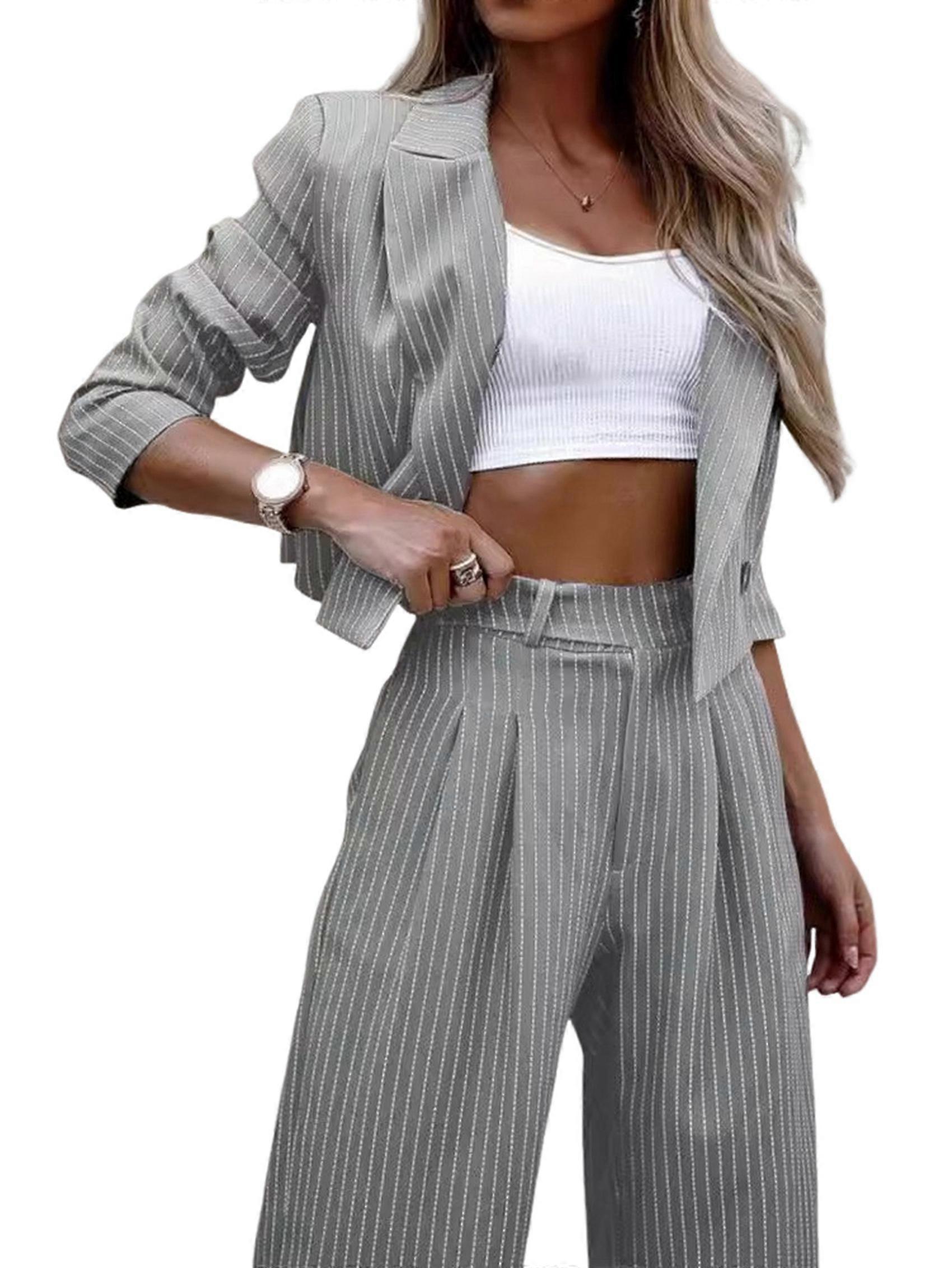 Women'S Two-Piece Suit Jacket Striped Cropped Lapel Suit Jacket High Waist Wide Leg Work Pants Business Suit Grey L