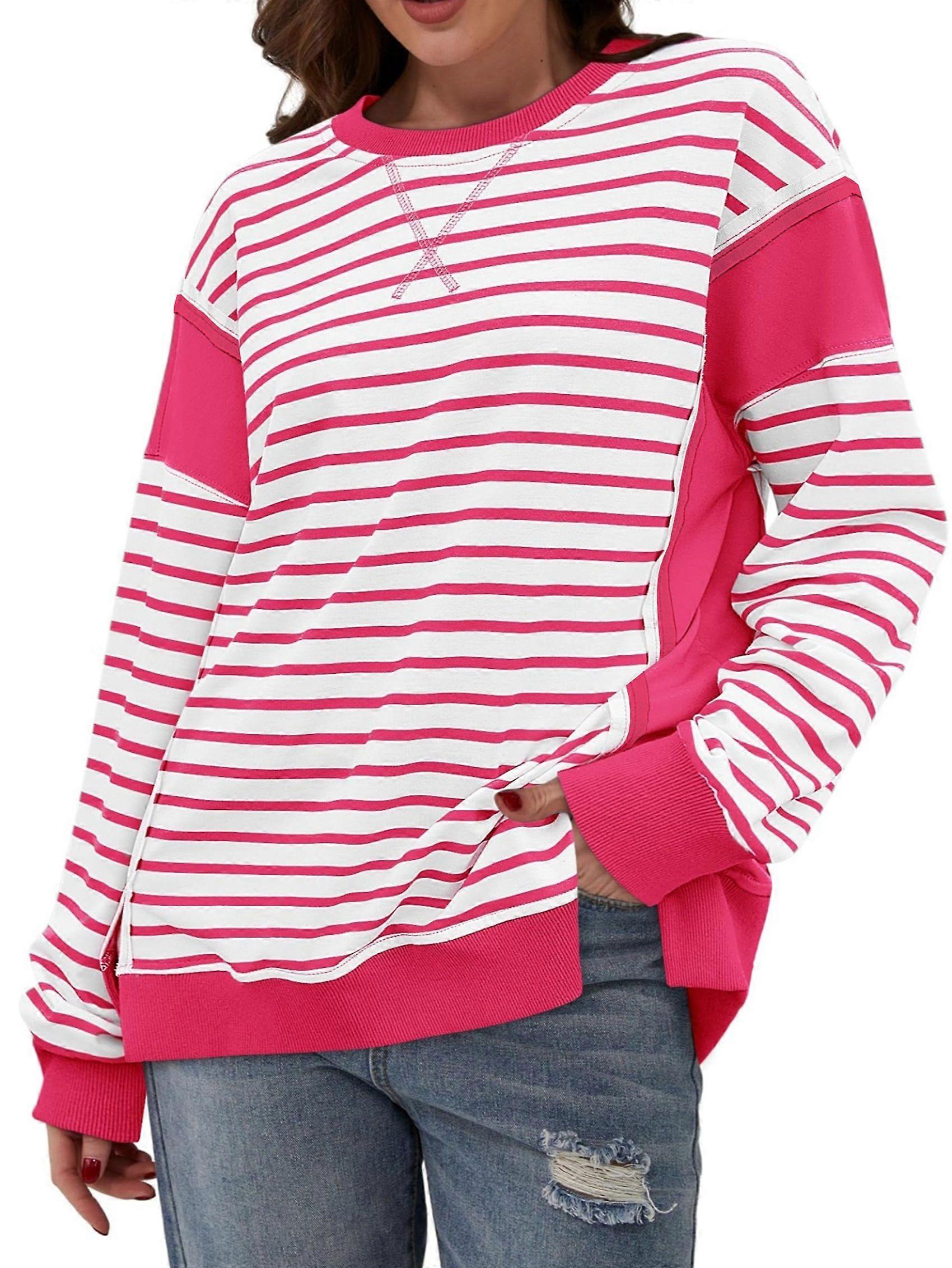 Womens Casual Striped Color Block Long Sleeve Crewneck Sweatshirts Pullover Tops Pink L