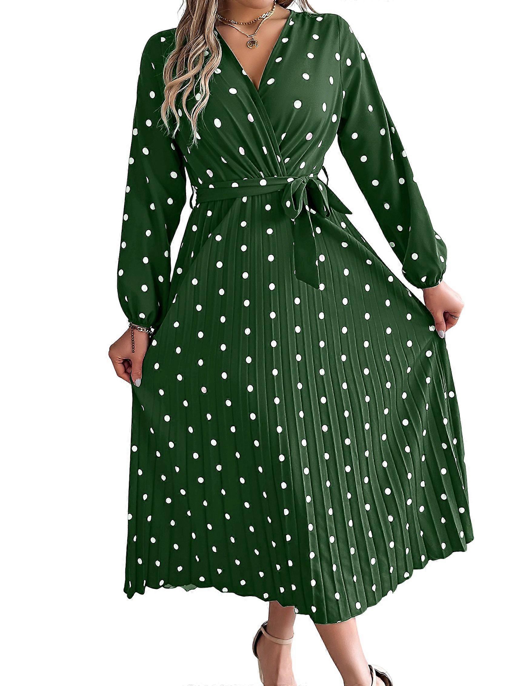 Women'S Polka Dot Wrap V Neck Belt Long Sleeve Pleated Maxi Dress Flowy Casual Long Dress Green S