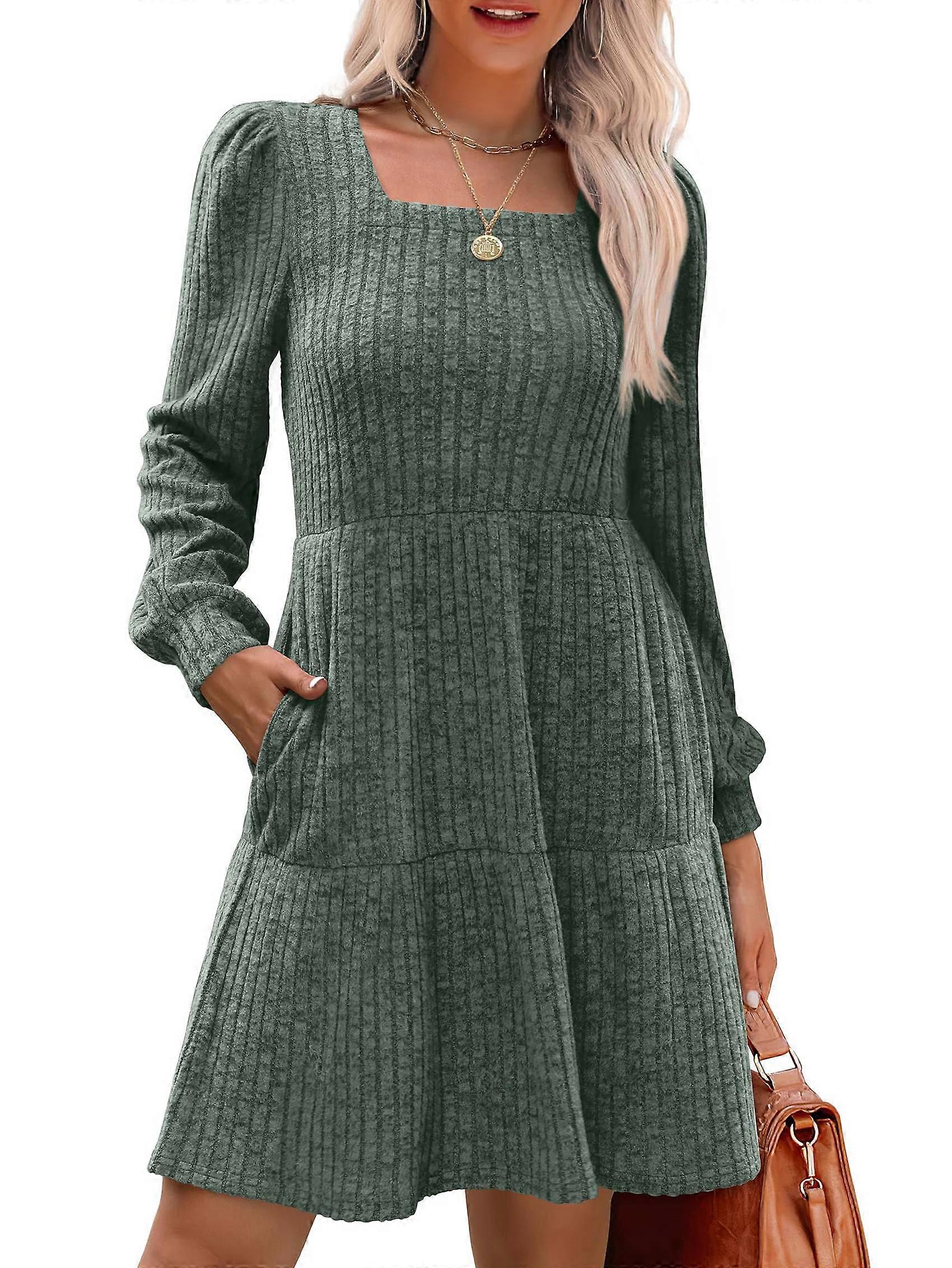 Womens Square Neck Long Sleeve Fall Dresses Casual Babydoll Sweater Dress Green XL