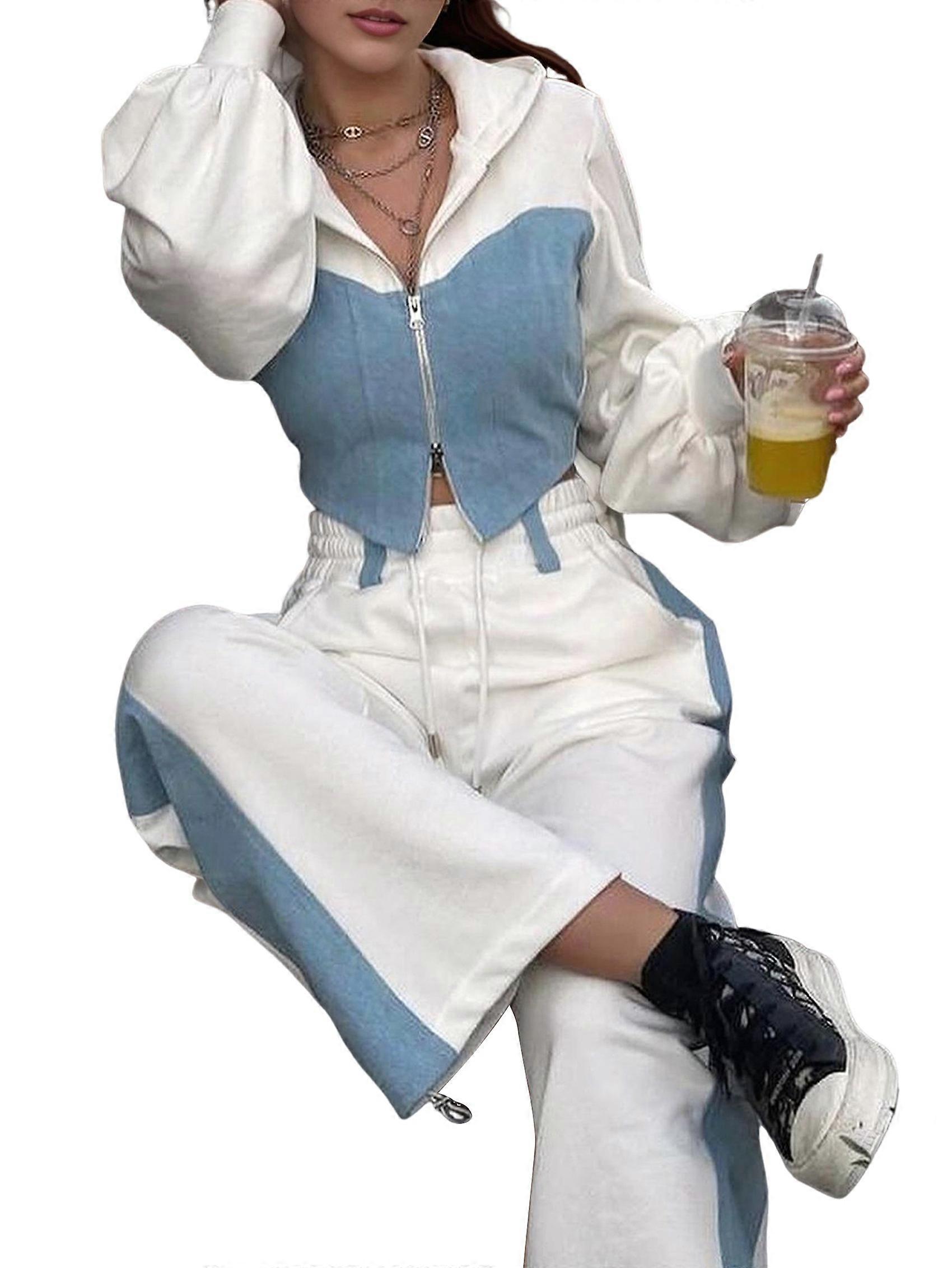 Casual 2 Piece Outfit for Women - Color Block Long Sleeve Zip Up Hoodie + Denim Drawstring Long Pants White XL