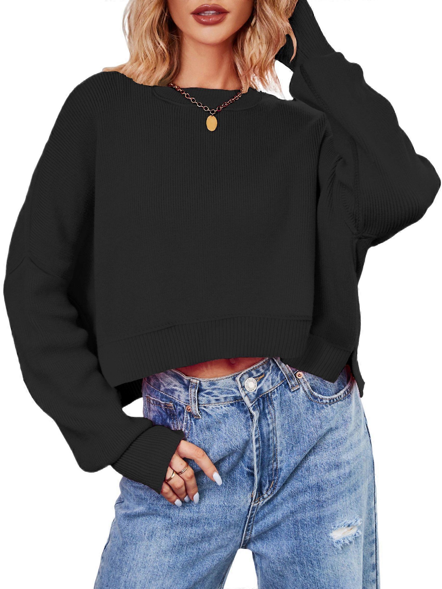 Women'S Oversized Batwing Sweaters 2025 Fall Outfits Trendy Crewneck Knit Side Slit Fashion Pullover Tops Black S