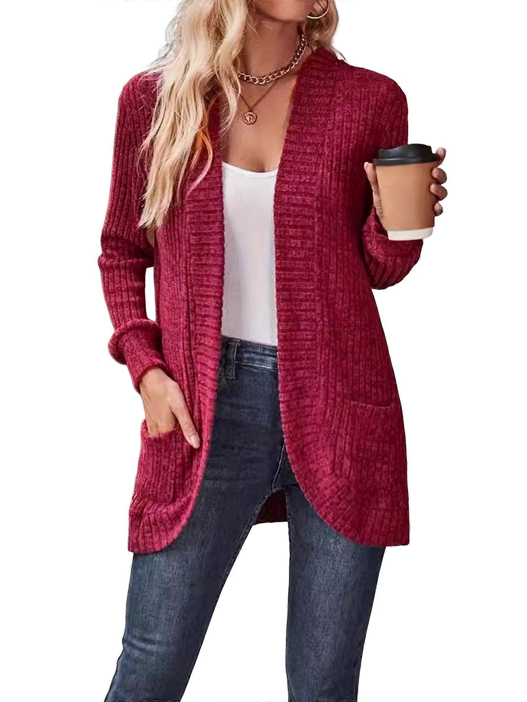 Women'S Long Cardigan, Autumn and Winter Long Sleeve Front Open Sweater with Pockets Wine Red L