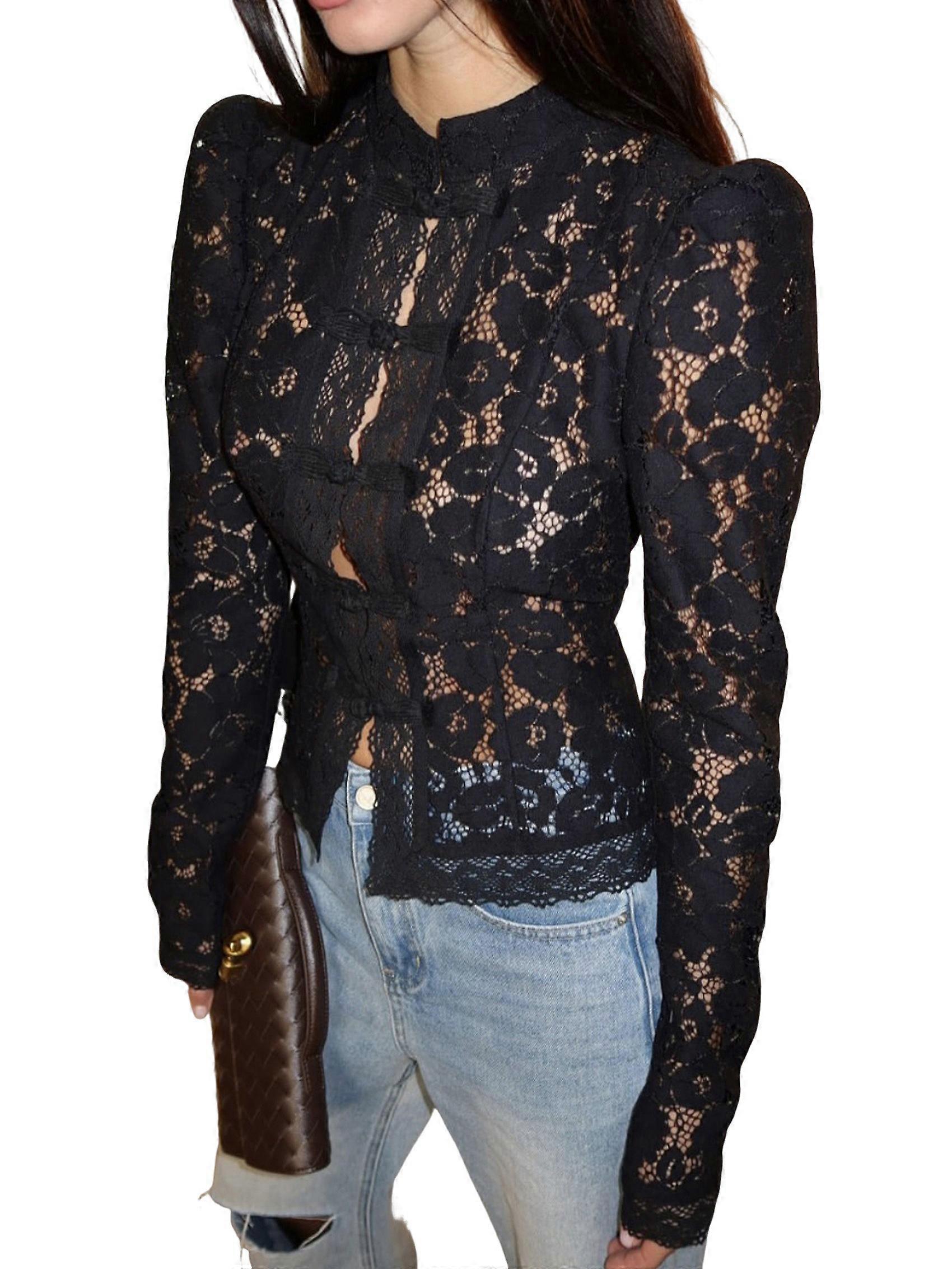 Women'S Temperament Commuter Lace Crochet Stand Collar Slim Design Shirt Long Sleeve Button Shirt Tops Black M