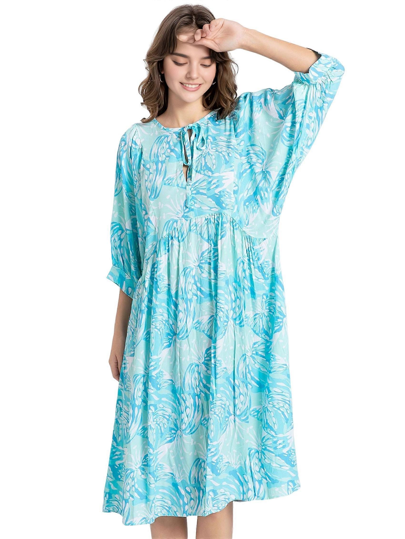 Womens Loose Fit Casual Summer V Neck Lace-Up Half Sleeve Bohemian Geometric Pattern Midi Dresses Emerald M