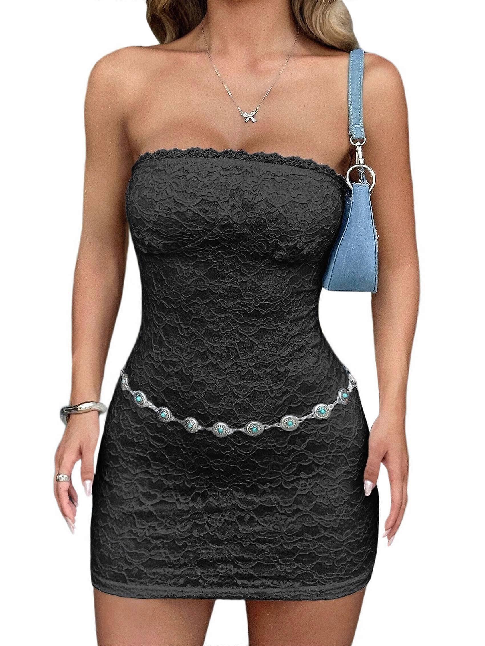 Women'S Y2K Lace Off-the-Shoulder Tube Top Hip Skirt Dress Party Mini Club Outing Short Dress Black L